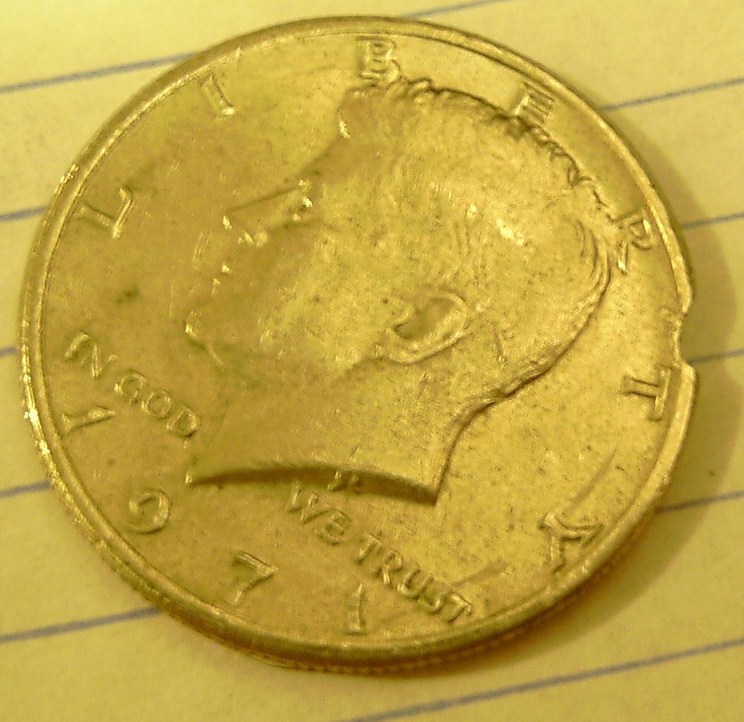 I found this while roll searching tonight I tryed to take some pics but the lights are to strong in the house.I do not know what it is or called but the pic I can not get is the edge of the coin . Inside the chip or what ever the damage is there are reeds just like the outside edge so that would have to mean MD Right? But I do not understand how it could have got reeded in the hole or chip.