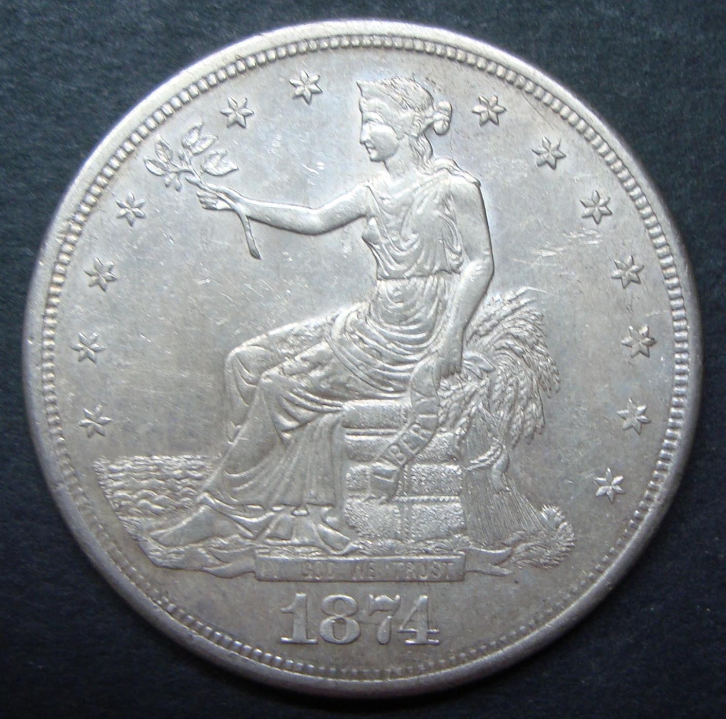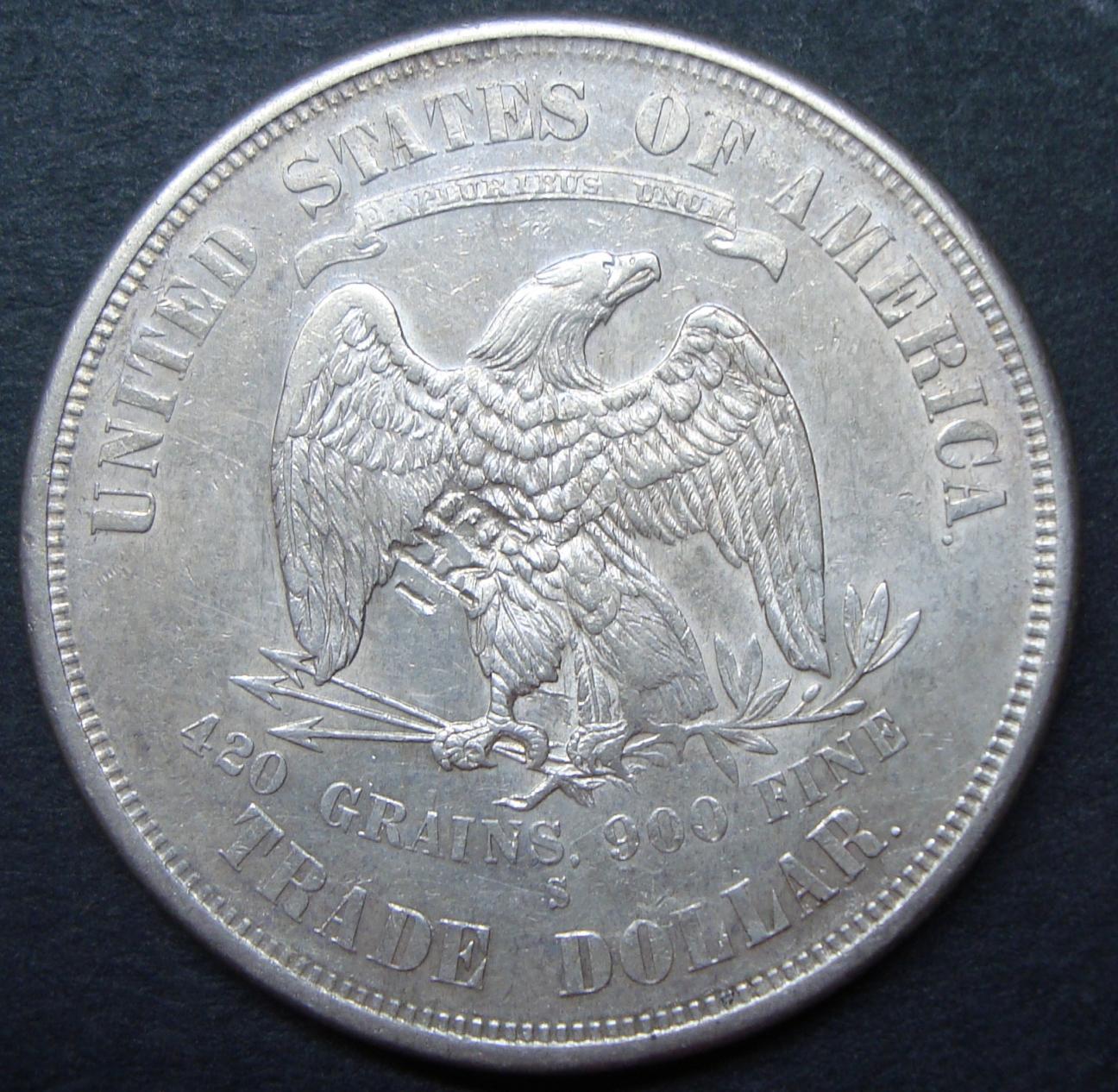 Trade dollars were made specifically for trade in the orient . They were distrustful of coins that might not contain the proper amount of silver . So they would test a few for fineness and then punch in a personal mark or chop to identify them as good coins . The chops look like Chinese characters in writing . Some might have one punch or as many as ten as each chopmark was known in a specific area . Sort of like if your town put a mark on it and then another official from another area would put his mark on it . Try googling chopmark . if this didn't help .
