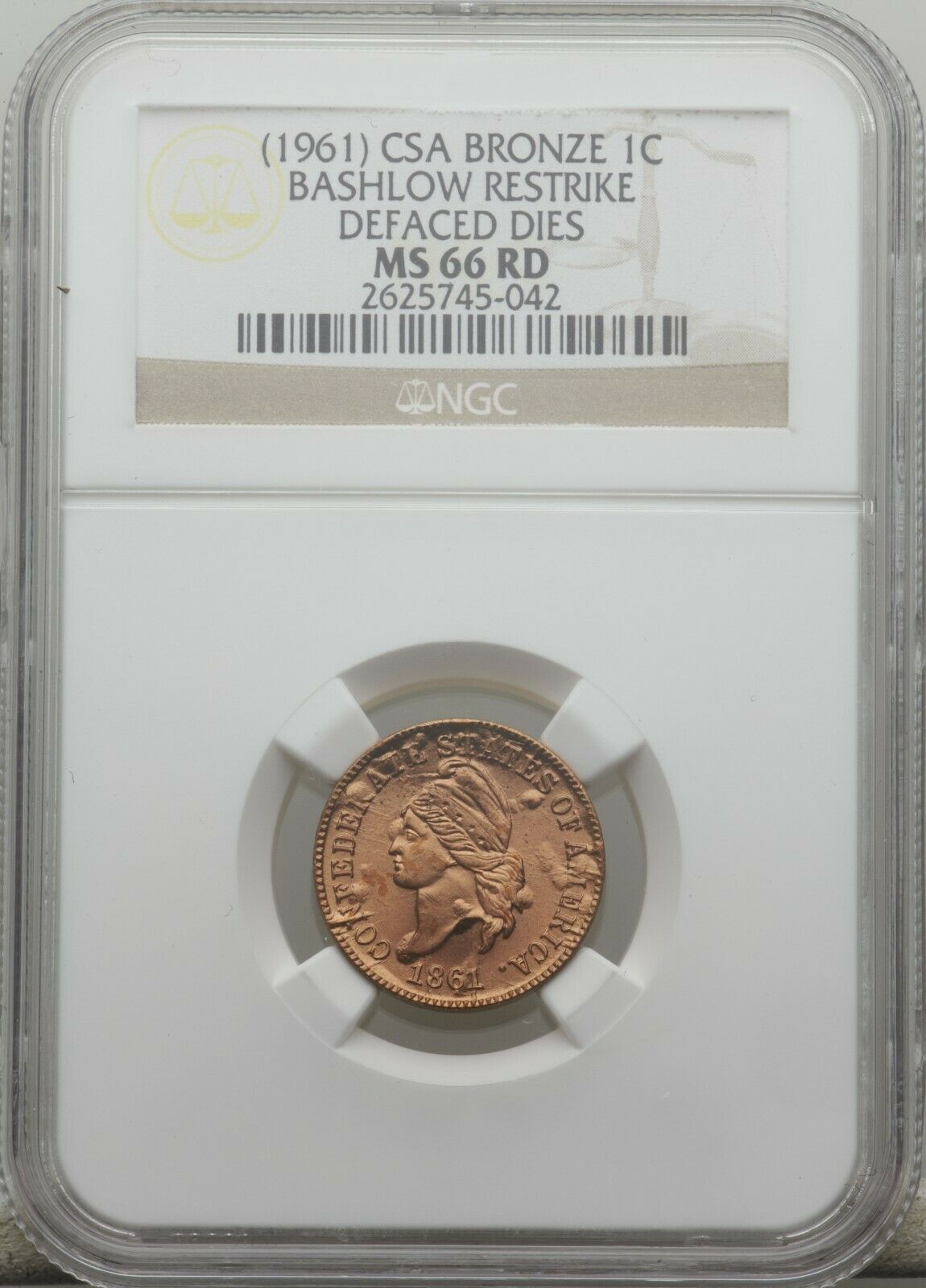 The full article is here ( https://blog.littletoncoin.com/strike-and-strike-again/) and it tells the story of the original CSA cent dies used to make this coin. I have quoted the part about baslow below They should have added "defaced" as well as rusted in the description below (those are chisel marks on the reverse of the die to "deface" it or prevent further use/minting) Quoted from "Littleton coins" Sometime in 1961, the now-rusted dies found their way to coin dealer Robert Socrates Bashlow of New York. Bashlow took the dies to August C. Frank & Company, a Philadelphia firm that specialized in making medals. Together, they worked on a special process to transfer the Confederate coin designs to new dies. Next Bashlow had the dies tested on several metals. Just 50 pieces of each of the first six test metals were ever struck, or 300 coins: nickel-silver, lead, zinc, red fiber, tin and aluminum. The seventh test metal was bronze – and the one Bashlow wound up using to restrike 20,000 of Lovett’s original one-cent design for the Confederacy. The following year, in 1962, Bashlow donated the dies to the Smithsonian and sold most of his Confederate cents to collectors