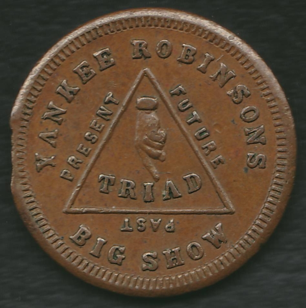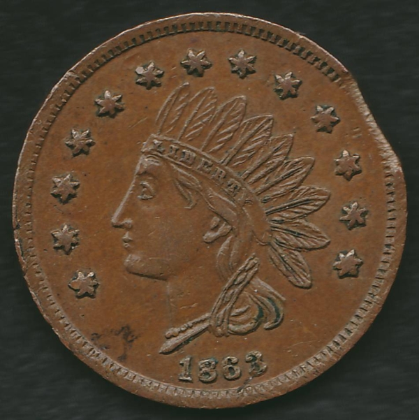 The Indian head is die 1046, and the only other 1864 dated die used for Yankee Robinson tokens is die 1047. The old number for the token itself is OH 165EZ-12a, listed as Rarity 6. I don't bother with the new numbers partly because they will be changing, the later-dated tokens will be separated from the Civil War dated tokens next time.