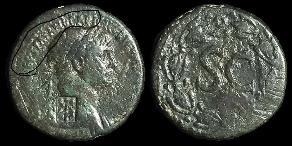 nice countermark/ looks like a butterfly Augustus helios countermark/ sestertius Helios Early Augustan Sestertius: Radiate head of Helios r.; std. lunar deity with crescent above head Also referred to as a 'nailed helmet'. Sometimes this 'radiate' head is found struck twice on examples of Augustan sestertii and, occasionally, it is found paired with this standing lunar diety. This latter type should make the 'Helios' designation of the other countermark a certainty. Countermark Martini Pangerl Collection 65.