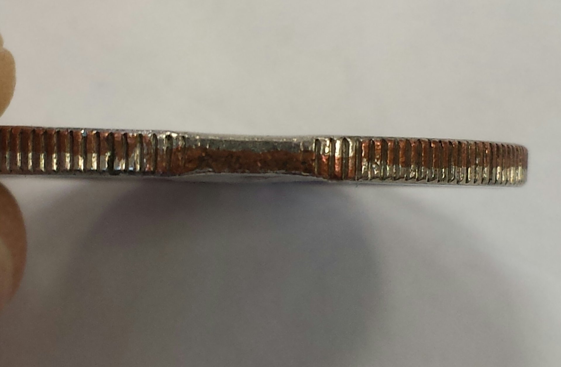 I think it's a clip. In both of the edge profile pics you can see the metal smear. from what I've learned, on a clipped clad coin, the clpiped area will exibit a reversal of the thickness of the layers. So, in your first edge view pic, you can see in the "normal" areas that the layers go thin top silver layer, thick copper middle layer, thick clad bottom layer, however in the clipped area I see a reversal of that pattern, it goes thick top silver layer, thick copper middle layer, which you can see the copper layer gets dragged down into the bottom clad layer. Then the bottom clad layer, where it was is thicker in the normal areas is now made thin in the clipped area. This comes from the metal getting dragged or smeared as the planchet gets clipped. Also the rim going into the clipped areas gradually disappeares. I'm pretty sure that's another sign of a clipped planchet. I'm certainly not an authority on these but from the minor research I've done on them this looks like one to me.