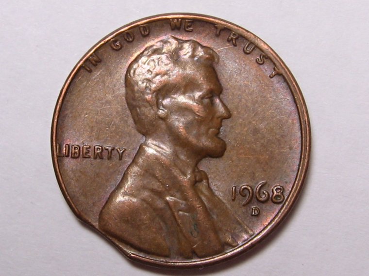 I'm no expert, but it looks clipped to me. Not only because it's a perfect, straight cut line that's consistent with a clip, but the color and patina are the same as with the rest of the coin. And there's no other surface damage to the coin...if the coin got caught between moving parts or a piece of machinery that would be able to grind it down like that, I would think there would be other surface damage...IMO -LTB