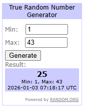 If I don’t get sidetracked or overwhelmed at work, I’ll try to do the drawing tonight (in the wee hours of Saturday morning, January 3rd, Eastern US time).