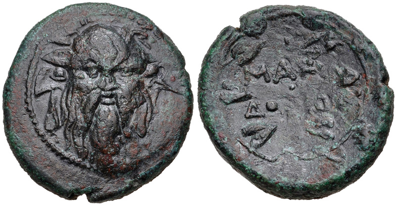 Curses, Clio! I'm sorry you lost that coin. It's an important acquisition if you need a lead singer for your heavy metal coin band. Here's mine MACEDON, under Roman rule D. Junius Silanus Manlianus, praetor 142-141 BCE AE, 20 x 22 mm, 9.5 gm Obv: Facing mask of Silenus, wearing ivy wreath Rev: MAKE ΔONΩN legend In two lines; D above; all within ivy wreath Ref: SNG Copenhagen 1324