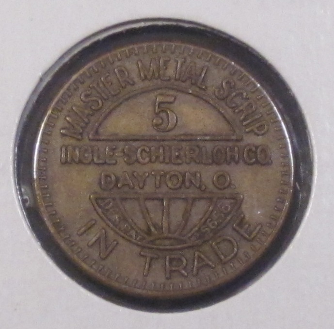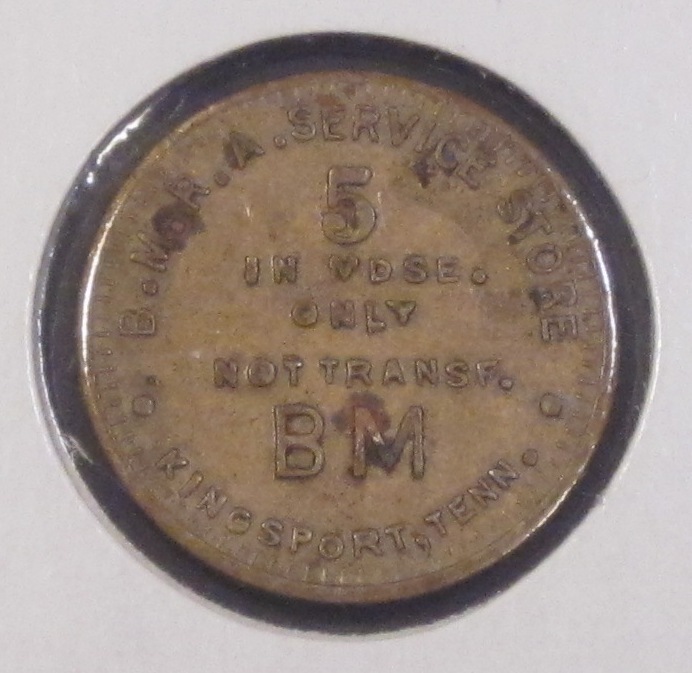 Obverse: Master Metal Scrip 5 in Trade Ingle-Shierloh Co. Dayton O. Reverse: B.M.R.A. Service Store Kingsport TN 5 IN MDSC ONLY Not Transf BM My friend has given this to me to research (in advance of my buying it). I would like some more information on the piece & obviously I would like to know how these things are collected & valued. BMRA in Kingsport TN could be the “Building Materials Reuse Association”. That doesn’t sound much like a coal mine so its got me thinking cheap merchant token. I believe that the Ingle-Shierloh company made scrip for coal mines among other things. Can you guys teach me something about this piece?