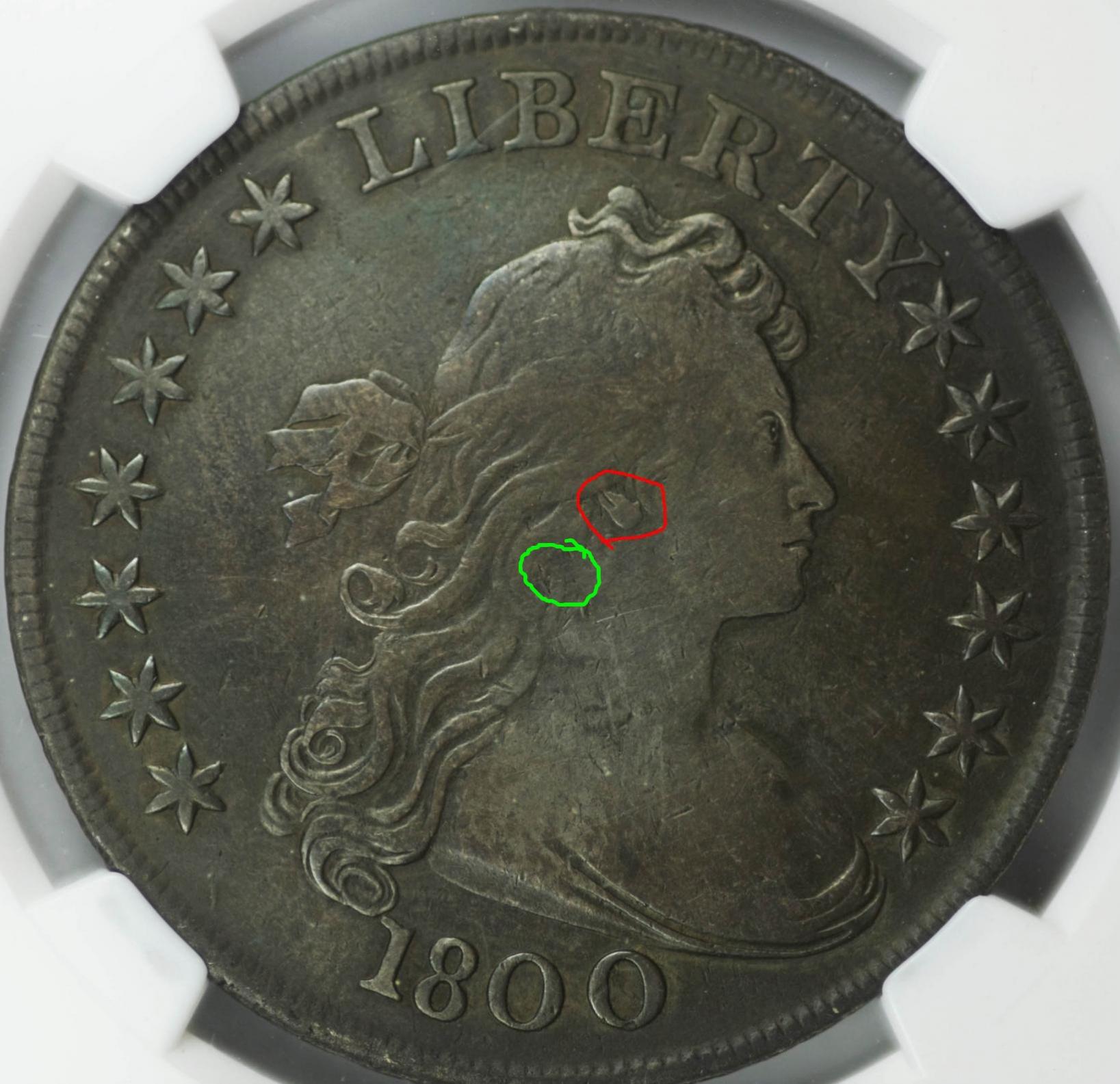 I recently bought this coin raw at a show like I do with many other early dollars. I am usually very good in detecting any problems with them. This one got past me and looking at this coin still don't see it jumping out at me. The thing that makes this coin so scary is just how good it looks. This coin was either holed or had damage to the point where someone used other metal to plug the damaged spot. The thing is that the plugging process will significantly alter the coins look. This after it was fixed was then doctored to look honestly really good. It's possible that it's right in the center of the obverse. I'm wondering if the grading companies aren't using something like a blacklight to see things on these coins. Even after comparing this coin to pictures of coins from the same die pair I see little difference.