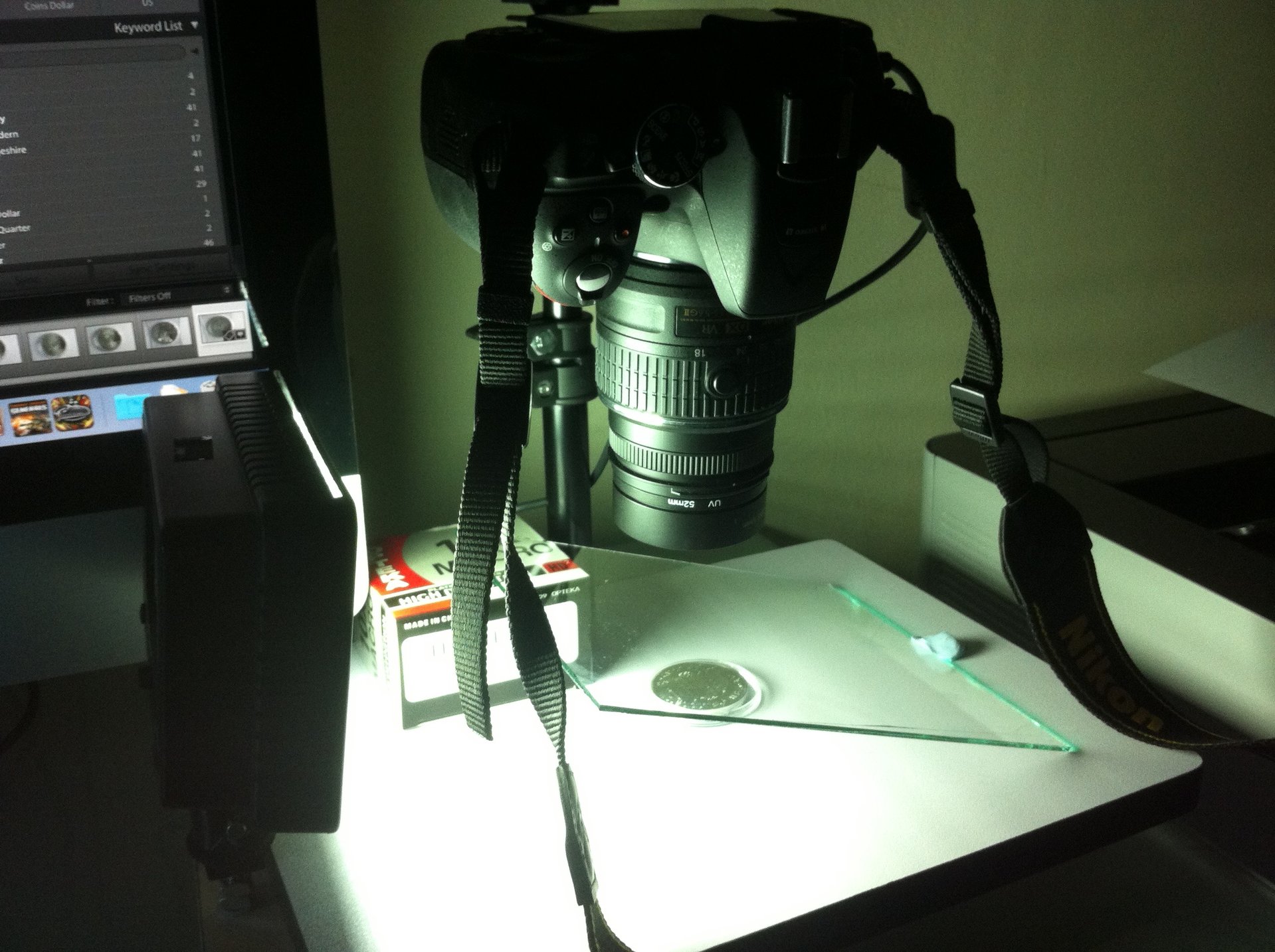 When I initially built my coin photographing box I designed it to look down on the coin but with this camera it would not work so I decided to go with a different design but still occasionally have problems with shadows depending on where my lights are it seems to work pretty good for me I just need to set up some kind a dimmer switch on it so I have better control over the lighting