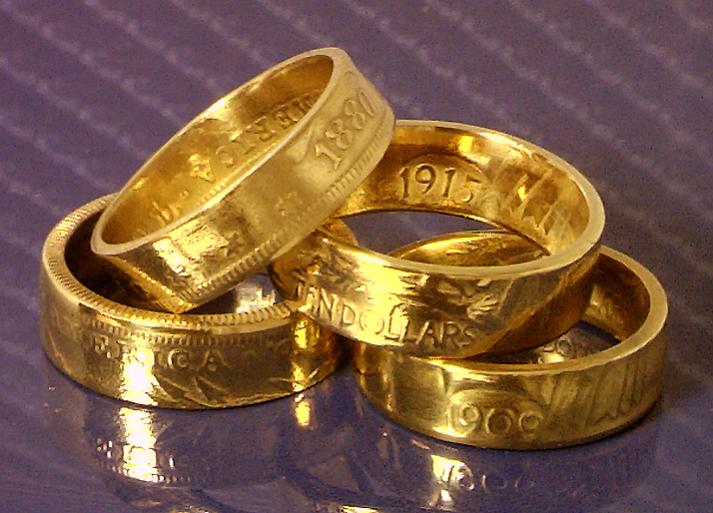 Ratio411, There are basically two types of coin rings, Those that are double sided like those pictured above and the hammered type you are interested in. Where the coin is put on its edge and hammered until the edge flairs out and the center is drilled out. This leaves the outside surface of the ring smooth (no detail). I have done both types and prefer the double sided type. I have found the hammered type are very thin on the edges and don't wear well. If someone wants a smooth outer band I just make a double sided coin and buff off the outside detail so the ring looks like a hammered one.