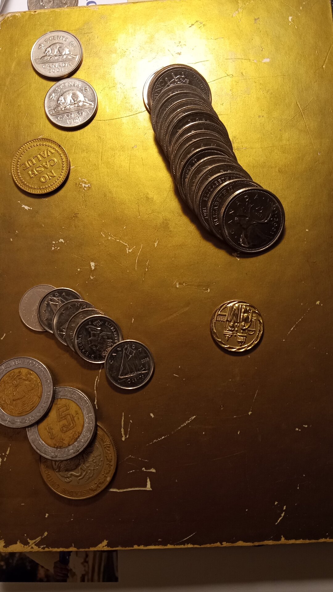 Couldn't believe the amount of coins in the reject slot and was pretty excited about it until I got home and realized they were all moderns. 17 Canadian quarters 6 Canadian dimes 2 Canadian nickels 2 five and 1 ten Mexico Pesos 1 no cash value token and one small medal of some sort. I'm guessing somebody dumped a whole bunch of change and added those seeing if any of them would take and when they didn't just left them behind.