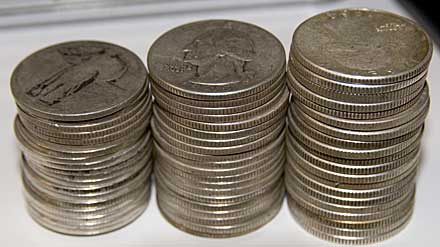 Wow, I thought I'd be doing a little better at getting new material posted here... I wanted to do a quick snapshot addressing the "height of a stack" question. People have observed that you can fit more (say) worn Walking Liberty halves than Kennedy halves into a coin tube. How much "thinner" do coins get as they wear? Here's a comparison between a stack of nice 1963-1964 quarters, a stack of well-worn Washington quarters (mostly from the 40's, a couple of AGs, most G-VG, and a few F), and a stack of well-worn to dateless SLQ's (the kind that make it into junk silver lots). Each stack contains 20 coins. Heights: 27+ mm, 31 mm, 34mm Weights: 116.35 g, 122.12 g, 125.35 g So, yes, those stacks do get distinctly shorter with wear. For the Washington quarters, a full roll of worn ones would be about "four quarters" shorter than a full roll of AU/BU. That's about 10%. The SLQ's are shorter still. But the weights don't decrease nearly as quickly. That 10% "thinning" of the Washingtons corresponds to a mere 3% loss in weight, and even those slick SLQ's, 20% "shorter", are only down about 7% in weight. This isn't really surprising. Wear takes down the high points of the coin first, and those high points determine the spacing of coins in a stack. (I don't have enough well-struck examples to do a comparison of different uncirculated types, so I still don't know whether full-strike Walkers stack more or less densely than Kennedys.) I should probably do the same comparison for Mercury dimes, which get really slick and lose proportionally more weight with wear. I have a stack of pretty nice uncirculated Mercs now (not slab-worthy or FSB, but unworn), and quite a few BU Rosies, so I can do the between-type comparison there as well.