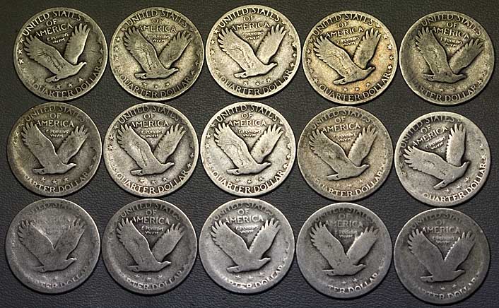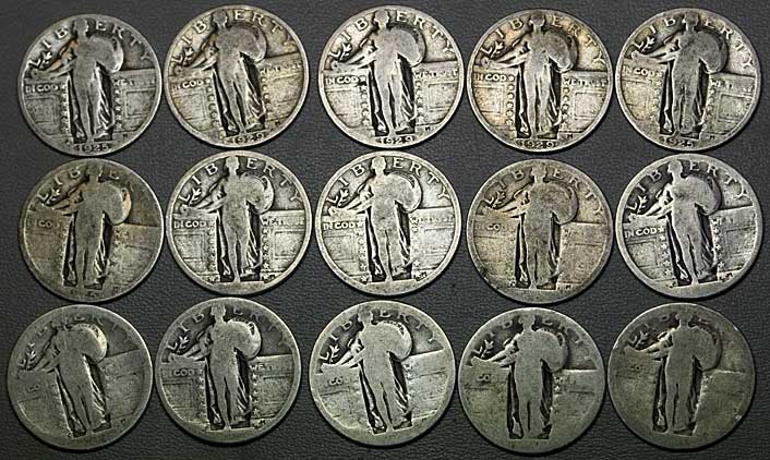 I decided to go ahead and spawn off a new thread where I'll post photos and high-resolution (10mg or 1mg) weights of coins in various states of wear. For now, I'll just be posting as I get and/or weigh things; later, I hope to put all this together into some organized format. Tonight's subjects are 15 SLQ's that I recently landed on eBay "below spot" -- at the time I bought them, Coinflation was quoting quarters at just about 20x FV, or $75 for 15, and I paid $68 with shipping for these. Nominal weight for 15 quarters as minted is 15 x 6.25 = 93.75g. These, though, range from G04 (there might be one that reaches G06) to PO01 -- pretty sad shape, but pretty typical for bulk circulated SLQ's. Here are the coins (obverse and reverse): Here are the weights: 5.96 6.06 5.97 6.03 5.88 5.80 5.96 6.00 5.79 5.84 5.66 5.81 5.75 5.75 5.59 Total weight: 87.85g. If 15 full-weight quarters contained $75 worth of silver, these would contain $70.28 (ignoring the probably-negligible weight of tarnish and debris they carry). I'm still ahead, but the "wear penalty" on these coins was about 6.3%.