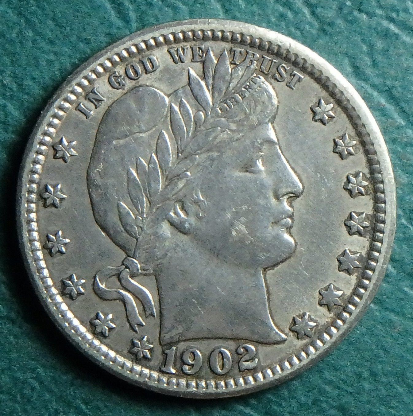 Here's my 1902 Barber quarter, its a P not an O, and I am drinking whisky, and yes, I know how to spell it.