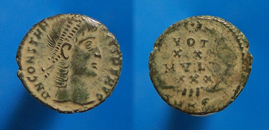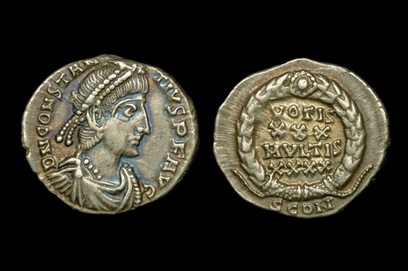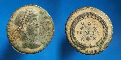Wreaths around votive numerals are a common Roman type of the 4th century AD. This sample is a silver siliqua of Constantius II with a high number so it was issued in the last years of his reign (died 361 AD).