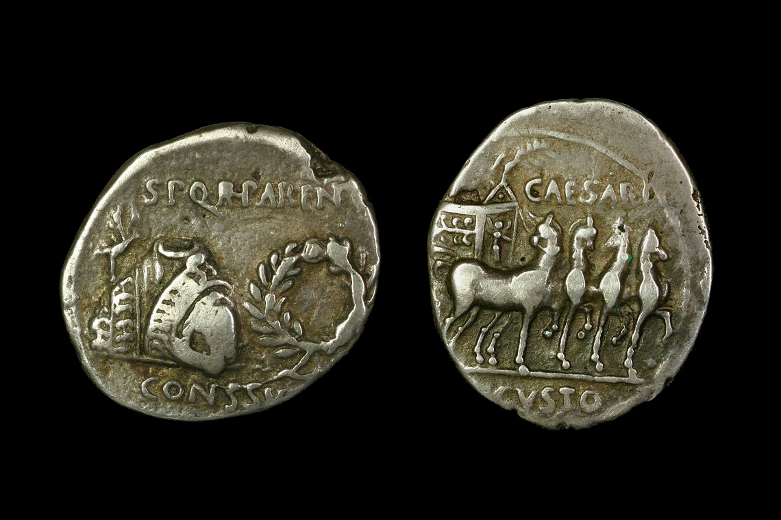 All the posts so far have one thing in common - the wreath is shown centered on the round coin. Here is a Roman denarius of Caesar Augustus with a wreath as more than a small decoration held by a figure or worn as a crown (both common on ancients) but not filling the entire design. The wreath is shown next to a pile of consular robes honoring Augustus' preparation to assume that office but it might be the only coin showing a pile of laundry. Who else has a wreath not centered on the field.