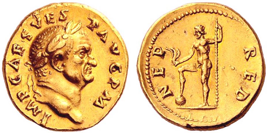 One of the sub-themes I've attempted in my collection is to collect interesting reverse types -- at least, interesting to me. This aureus of Vespasian fit that theme with its portrayal of Neptune on the reverse: VESPASIAN 69 - 71 A.D. AV Aureus (7.35 g.) Rome Jul. - Dec. 71 A.D. IMP CAES VESP AVG P M Laureate head right. Rev. NEP - RED Neptune standing left, right foot on globe, holding acrostolium and scepter. RIC 44 Vespasian's portrait is reasonably good style, but Neptune on the reverse is what caught my attention. Something about it reminds me of the Domitian sestertius I posted earlier in this thread - the one with Mars on the reverse.