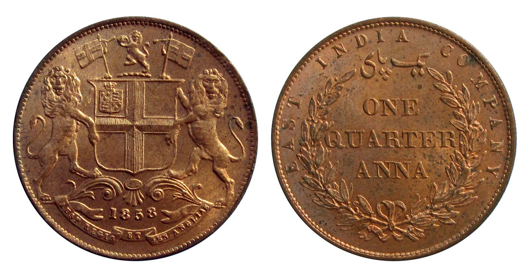 I took the train to Boston Saturday and visited the Bay State Coin Show. I had charged the camera with the intent of posting some photos at CT. However, I just had too much fun during the 1-day adventure & basically just forgot to take out the camera. I can show you the coins I purchased but you will not see the Boston skyline, Chinatown, or my lobster “clam-bake” dinner. There were several great dealers in attendance with their great coins. I saw many deals being made between dealers. On more than one occasion I had to wait or come-back later to accommodate the dealer-to-dealer business. I’m happy with the few purchases that I made. There was plenty of expensive ancient material but I’m trying to save some coin money for an upcoming show in NY and the FUN show. The first coin I found was this 1858 ¼ Anna from the East India Company. It was offered by Allen Berman. It is quite red which is what attracted me to the piece.
