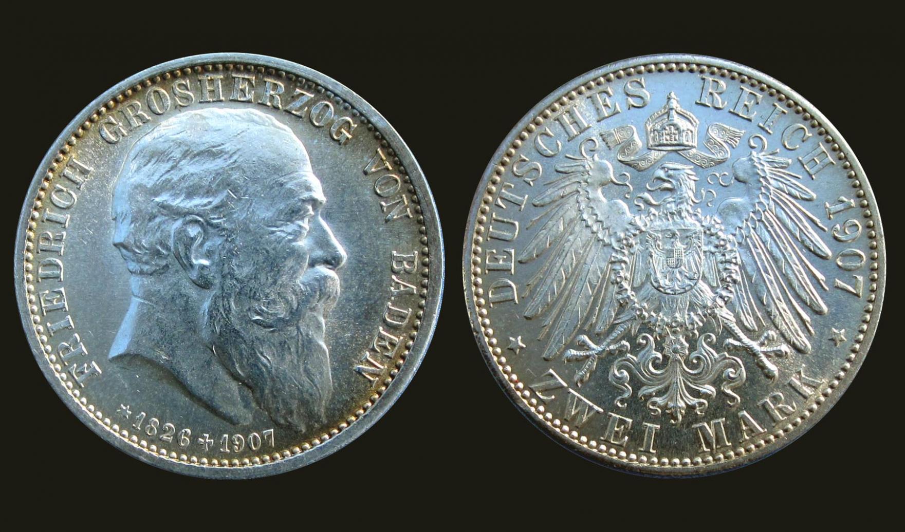 I first noticed my final purchase from about 3 meters away. It was bright & glistening in one of Glenn Schinke’s cases. When I got closer, I saw that it was a common 1907 Baden 2-Mark but exceptionally bright & glistening. (My photo does not do the luster any justice at all). This one has the commemorative date 1826-1907 indicating the death of Friedrich I. Thanks for letting me share & please post some of your coins.