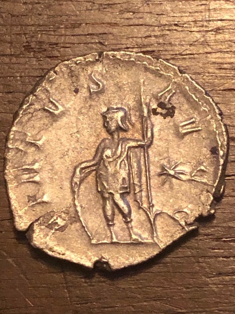 Now you tell me! Thank you. The reverse of the Volusianus says: "VIRTVS AVGG" depicting Virtus standing, head left, holding shield and spear. Virtus is a deity who personifies virtue.