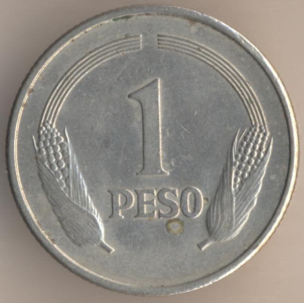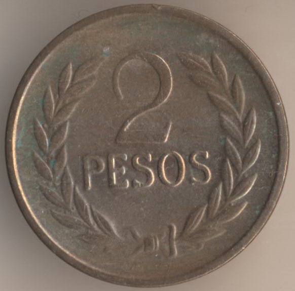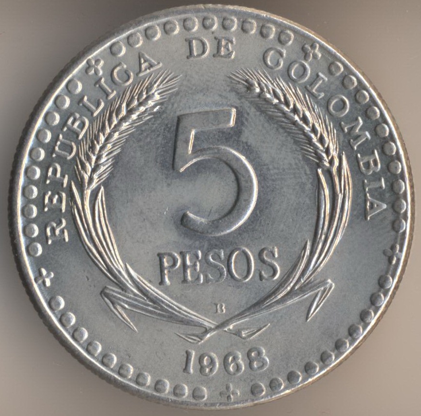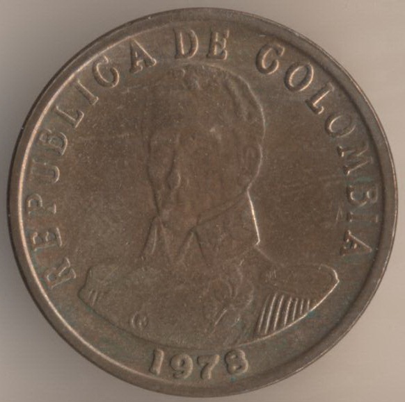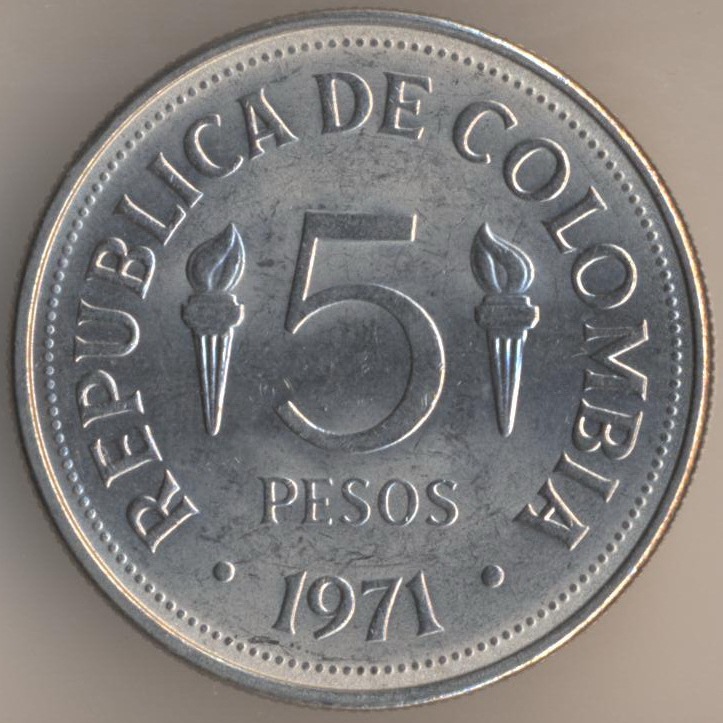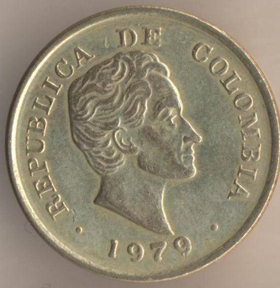 5 pesos 1980. Common coin from circulation. Woman on obverse - it is Policarpa (heroine of Colombian Independence Movement during the Independence war against Spain. She has been executed by colonialists).