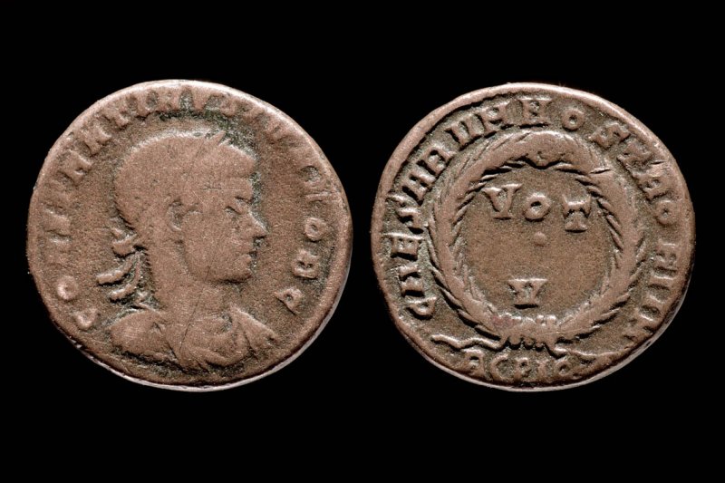 Cryptic message? How is this? The mintmark on this common reverse of a common Caesar is what is special. It is found on two reverses for all of the active rulers at that time from the Rome mint. This is the Vota in wreath type. The other type, like the Commodus, is Romae Aeternae. I don't have it in Constantine II but here is my Constantine I: Reading the mintmark: R is for Rome (Roma) followed by a ligature of Greek letters EPWC or Eros the Greek word for love. What is Latin for love? Amor. If you spell Amor backwards you get Roma. This is the strangest mintmark I know. Following the ligature is a workshop letter completely illegible on the coin I got from Randy and half off (possibly S?) on the Constantine I. Neither of these are very nice examples but fully legible and high grade examples sell well when they come up. I lost a really nice one that went over $200 once. See RIC Volume VII pages 317-320. If you get one trade me. I have more Commodus denarii. :yes: