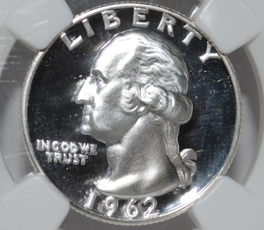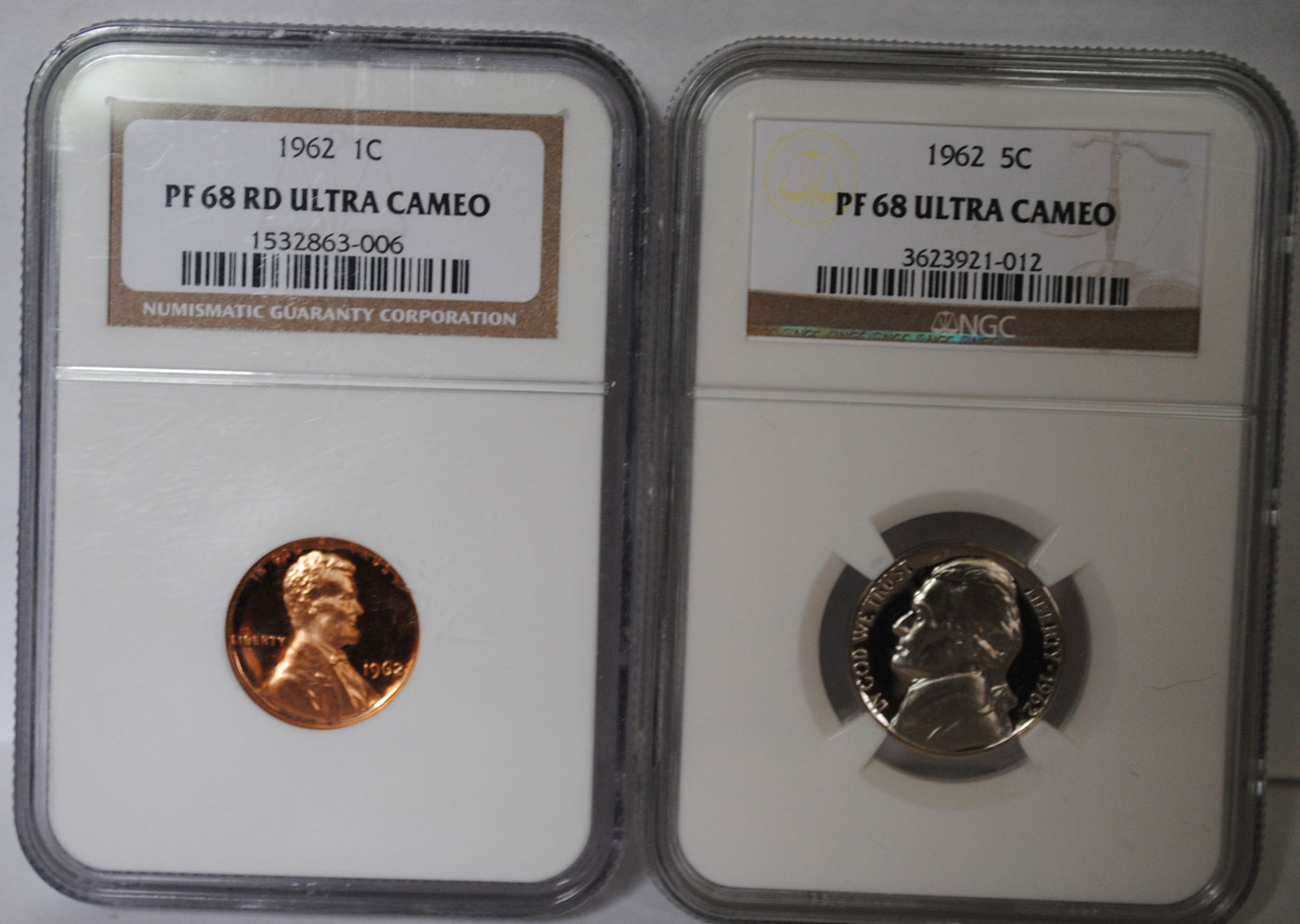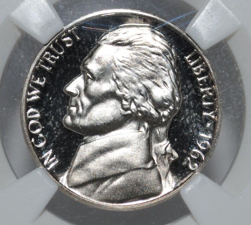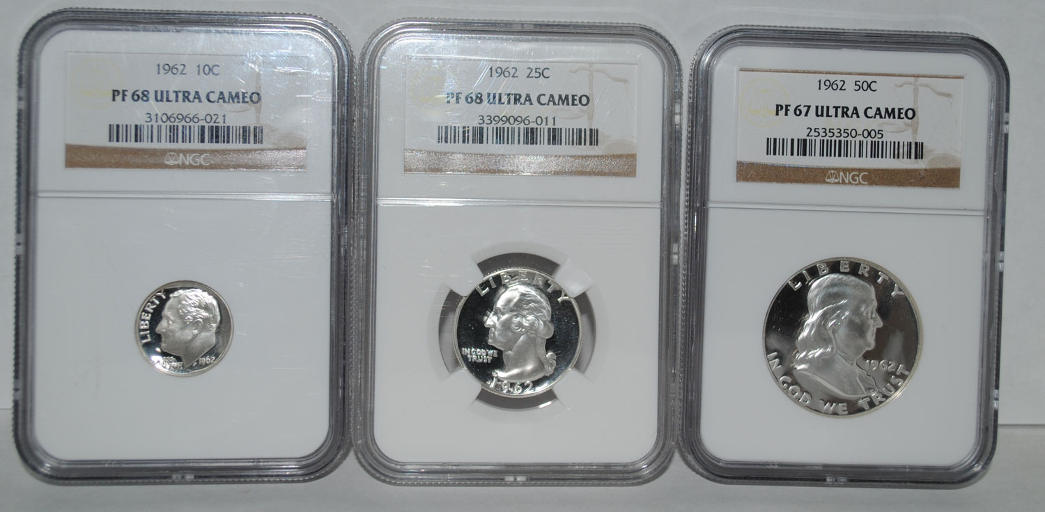 ok... I have been talking for a long time about assembling a proof set from 1962 (my birthyear) in Ultra Cameo. Some may not know that prior to 1973, Ultra Cameo proofs are generally the exception and NOT the rule as they are today, thus making the coins a bit harder to find and REALLY hard to find at a decent price. I have been assembling this set for over 2 years and on my birthday yesterday I received the last coin to complete the set! Now, while none of these coins are rare, in fact, 1962 Proof Sets are pretty plentiful, but the cameo proofs are less common. That said, there's a bit of a high risk - high reward game when it comes to slabbing them. Not many people will take the gamble on such a common coin, so there are small populations certified. I made finding a nice Cent and Nickel more difficult than one would imagine, especially on a budget. The common mirror proofs command virtually no premium. The Cameo proofs garner a small premium, but The Ultra Cameo proofs garner a good premium and in the case of Franklin Half Dollars a large premium, especially at PF-67 and above. So, without further adieu, I'd like to present my now complete 1962 US Proof Set in Ultra Cameo (NGC) My apologies for 13 pictures, I put them in the next few posts so that this introduction would at least load faster.