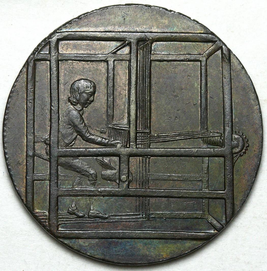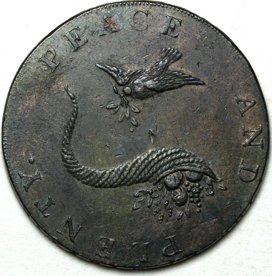 Lancashire 150 or 150a depending on the edge. Not too hard to find, there are only 7 English tokens with the "Peace and Plenty" inscription. Essex 8, Hampshire 11 and 12, Kent 4, Lancashire 150, Middlesex 1167 (which is a farthing) and Norfolk 26. Of course I cheat. I have an index of all the token inscriptions with all the D&H numbers that that inscription can be found on. Look up the inscriptions for each side and see which D&H numbers have both inscriptions. In most cases I can narrow a token down to one or just a couple possibilities in under two minutes. Oh 150 edge is PAYABLE IN HULL AND IN LONDON -XX- 150a edge is WILLY SNEDSHILL BERSHAM BRADLEY Lancashire 150 was a mule made for general sale to anyone who wanted them so there is no mintage record. 150 is common, 150a would be an R-6 on the Sheldon scale. Although it is attributed to Lancashire it was most likely made by John Hancock of Birmingham, Warwickshire and I suspect they were made for use in Yorkshire as the planchets of 150 seem to be leftovers from Yorkshire 22 - 25. (The planchets for 150a are leftovers for pieces made for John Wilkinson tokens, attributed to Warwickshire by D&H but actually located in Shropshire.)