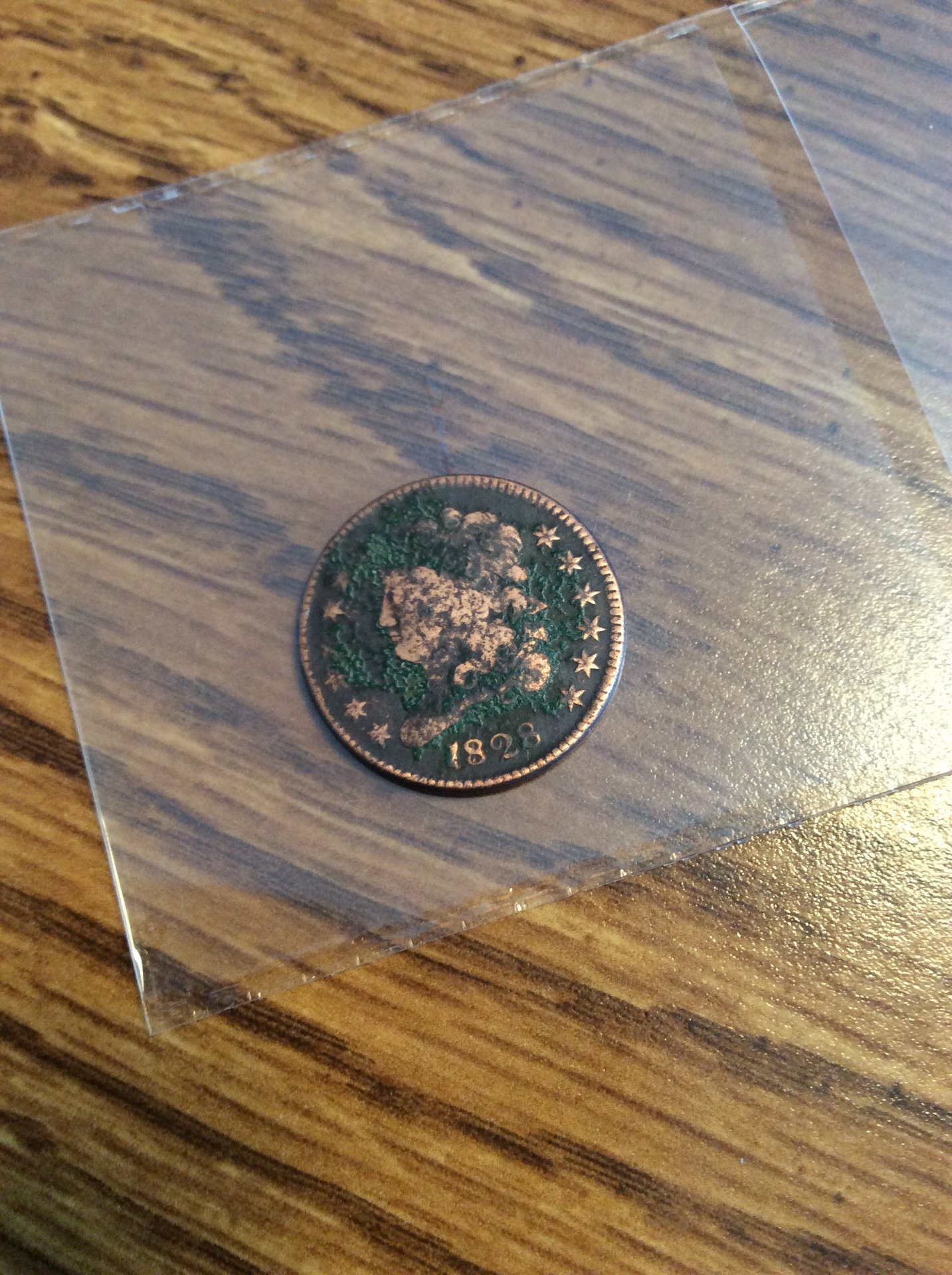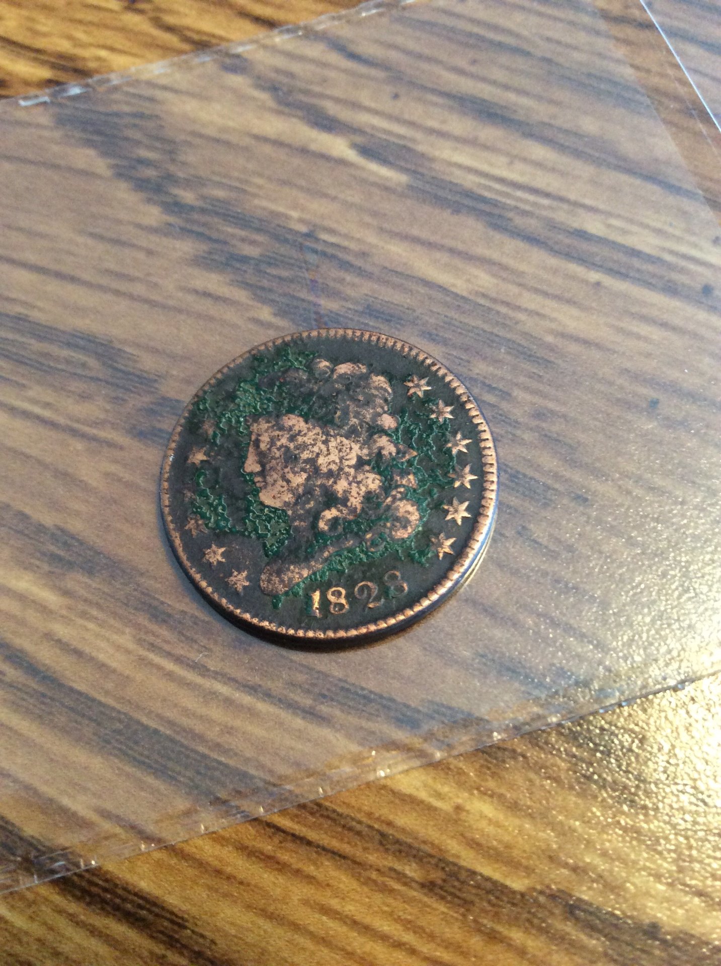 First the Bad news: Don't even bother spending money on this piece. What you have is a corroded "cull." Now the good news: Your coin is virtually worthless. Therefore it is perfect for you to play with and learn something from it. Believe it or not, it can be changed into a corroded brown coin in the right hands. Unfortunately, those guys don't want you and I to know their tricks. Here is my suggestion. Work on ONE SIDE at a time with different chemicals suggested by other members. That way, it's like having two coins to experiment on. In fact, if you wish to try Verdi-Care, put a large drop on ONE HALF of ONE SIDE. Then, you'll have "four" surfaces to play with. NO Scrubbing with anything hard until you learn all you can and take a wire brush to it. only kidding. PS If you decide to have it professionally conserved and do not wish to pay for the service, send it into ICG and ask them to conserve it before they grade it.