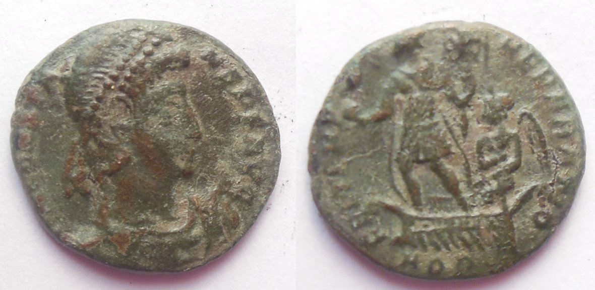 Constans. AE3. 337-350 AD, Aquileia mint, 2.6g, 16mm OBV: DN CONSTA-NS PF AVG, Pearl diademed, draped, cuirassed bust right. REV: FEL TEMP-REPARATIO, Emperor in military dress standing on galley left, holding phoenix on globe and labarum, Victory sitting at the stern, steering the ship. Mintmark AQP. REF: RIC VIII Aquileia 109A This one is in rather bad shape but still identifiable. I have a better example that I may reshoot later. Wikipedia copy and paste history.