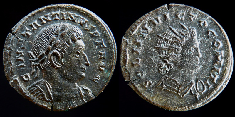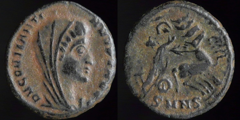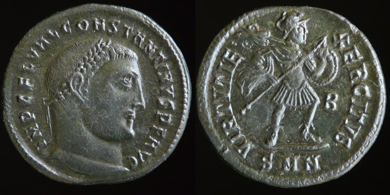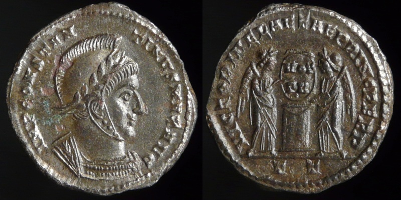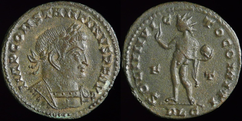 Want more Constantine, Randy ? Constantine the Great, Follis, Nicomedia mint, 2nd officina, c. AD 311 IMP C FL VAL CONSTANTINVS P F AVG; Laureate head right VIRTVTIE-XERCITVS Mars/Virtus advancing right in military dress, holding transverse spear and shield ; trophy over shoulder. B in right field. SMN in exergue. 4.88 gr, 22 mm RIC-, C-, Roman coins - RIC lists this type only for Licinius and Maximinus . "Iovi Conservatori and Virtuti Exercitus both appear for Licinius and Maximinus, emissions for the former being the more scarce: coinage for Constantine is extremely rare. Date, c. 311". Coin should be listed after NICOMEDIA 70c. Please see Victor Clarks website for further information at : http://www.constantinethegreatcoins.com/unlisted/ Constantine the Great, Follis, Lyon mint, 1st officina IMP CONSTANTINVS PF AVG, laureate and cuirassed bust right SOLI INVICTO COMITI, Radiate sol left, holding globe, F-t in field, PLG at exergue 4.37 gr Ref : Cohen # 513, Roman coins # 3868 Constantine the Great, Follis, No mint mark, attributed to Treveri CONSTANTINVS PF AVG, laureate and cuirassed bust right SOLI INVICTO COMITI, radiate and draped bust of Sol right 3.63 gr Ref : Cohen # 514, Roman coins IV # 3867 Q