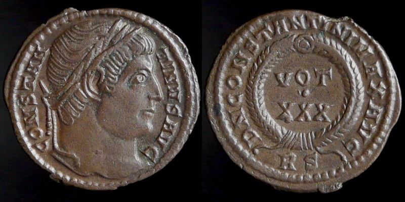 And even more, Constantine the great, AE 3, Rome mint, 2nd officina CONSTANTINVS AVG, Laureate head of Constantine right D N CONSTANTINI MAX AV, VOT XXX in a laurel wreath, RS at exergue 2.93 gr Ref : Cohen #129, RC #3874 var Constantine The Great, AE3, Ticinium mint, 3rd officina IMP CONSTAN - TINVS MAX AVG, Draped, cuirassed bust of Constantinus right, wearing laureate helmet VICTORIAE LAETAE PRINC PERP, Two victories, holding shield on wich is written VOT/PR, resting on cippus. TT at exergue 3.2 gr Ref : RC #3883 var Constantine the Great, Posthumous AE3, Nicomedia mint, 2nd officina D V CONSTANTINVS PT AVGG, veiled bust right Anepigraph, Constantine the great in a Quadriga right, SMNS at exergue 2.19 gr Ref : Cohen # 760, LRBC # 1132 That's all folks ! Q