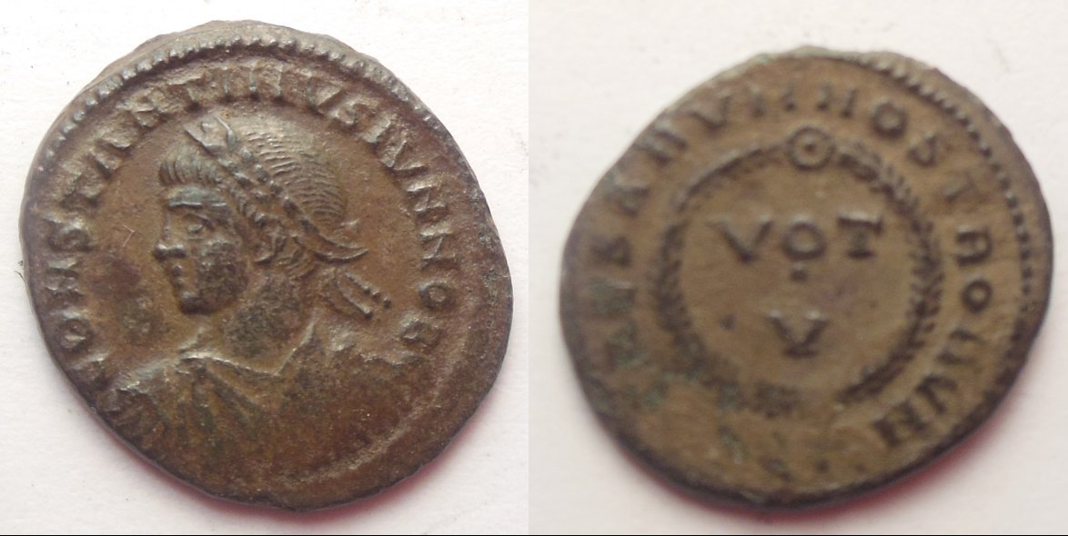 Constantine II AE3. 320-321 AD. Aquileia mint, 2.5g, 17mm OBV: CONSTANTINVS IVN NOB. Laureate, draped & cuirassed bust right, seen from behind. REV: CAESARVM NOSTRORVM, VOT V in wreath, dot in badge at top of wreath. AQT dot in ex. REF: RIC VII Aquileia 95v I slowly narrowed down the details to attribute this coin because the reverse mint mark is in rather bad condition but I do like the patina on this coin. I also believe it to be a variant or unlisted, perhaps. On the obverse it says CONSTANTINVS IVN NOB and not CONSTANTINVS IVN NOB C as expected. Wikipedia copy and paste history.