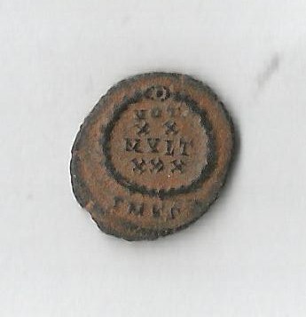 Here are some other votives LRBs Crispus, AE3 Aquilea mint, 2nd officina CRISPVS NOB CAES, cuirassed and laureate bust right CAESARVM NOSTRORVM, VOT/V within a laurel wreath, AQS. at exergue 3.22 gr Ref : Cohen # 31, Constantius II, AE3-4 D N CONSTANTIVS P F AVG, diademed head right VOT/XX/MVLT/XXX, within a laurel wreath At exergue SMANTI (Antioch mint 1.70 gr Ref : Cohen # 335, LRBC # 1398 var, Jovianus, AE3 struck in Sirmium, 2nd officina D N IOVIANVS P F AVG, Diademed and draped bust of Jovianus right VOT V MULT X IN A LAUREL WREATH. BSIRM at exergue 3.32 gr Ref : Cohen #35, RC #4087, LRBC #1624 Arcadius, AE4 Heraclea mint, 1st officina, c. AD 383 DN ARCADIVS PF AVG. Diademed, draped and cuirassed bust right VOT / V within wreath, SMHA at exergue 1.27g, 14mm, 12h Ref : RIC IX # 18b, LRBC II # 1964 ....