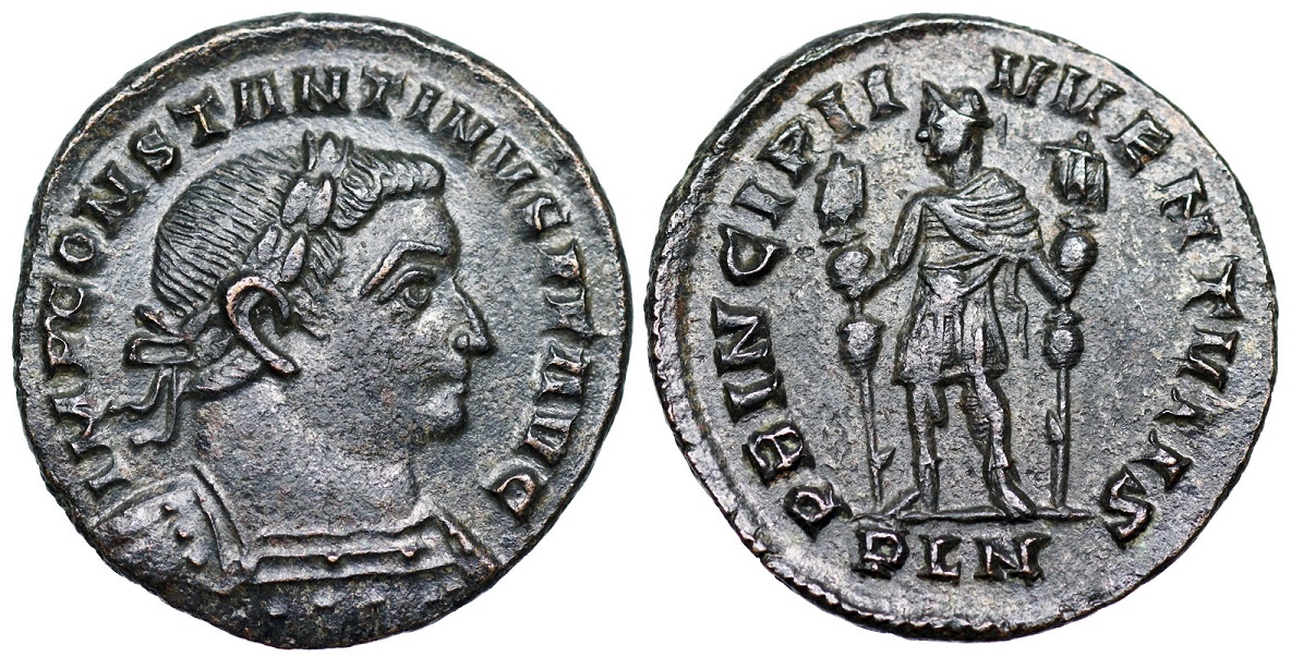 “Four entirely new types were created for Constantine, GLORIA EXERCITVS, GLORIA ROMANORVM, LIBERTAS PVBLICA, and SPES PVBLIC…Here the reverses record a summing up of the Civil War II, the glory of the army constituting the glory of the Empire, the death of the tyrant (SPES PVBLIC) granting liberty for all.” RIC VII pg 567.