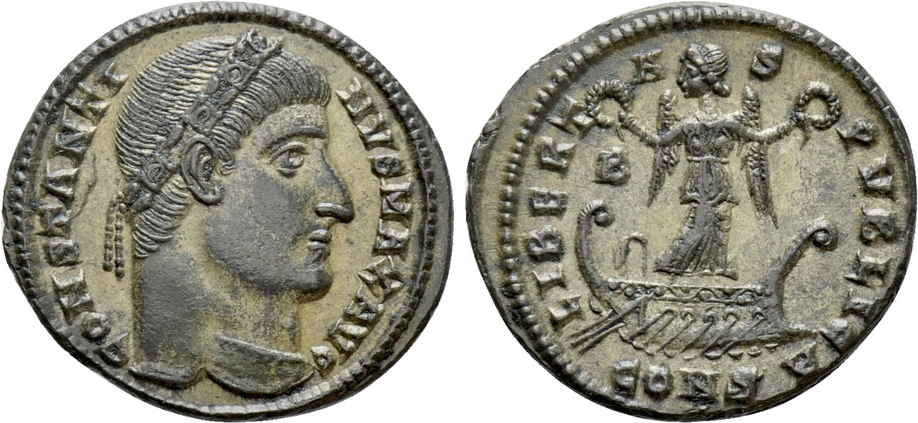 Constantine became sole ruler after he defeated Licinius in A.D. 324 and his new city of Constantinople struck a series of commemorative coinage.