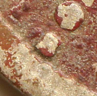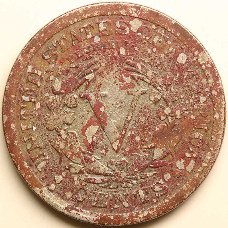 Here's another item from the eBay pig in a poke I got a while ago. I was going through the V-nickels, sorting out some of the more unfortunate ones for another thread, when I came across this beauty: I had to stare at it for quite a long time, with different lighting and magnification, before I could be sure that this "blob on the back" wasn't going to be the same Disappointment that I've found on all the other 1912-blob V-nicks from various batches. Close-up, though, it's pretty unambiguous: So, is there anything to be done about this blotchy-pink corrosion? I'm not planning on doing anything rash to this coin, certainly not hitting it with vinegar or the like, but I can imagine it being made a bit more presentable. Any ideas/experience? (In this shape, I don't think it's worth shipping to NCS; I imagine there's a market for it on eBay as-is, anyhow.) Thanks to CTDirtFisher for his recent post of an even better find, which got me motivated to go ahead and post this one as well. You win this round, CTDirtFisher...