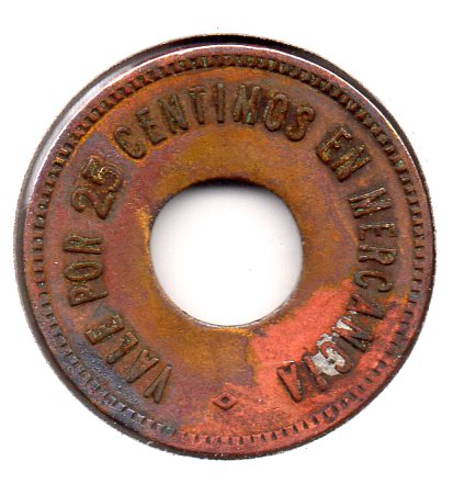 Don't know much about it other than an old Costa Rican man who had it said he used them on a plantation's little general store. I found it listed on a token website which had it numbered as Bs24 and R-CR16, circa 1960, Value $4.00 starting in Fine condition. Here's the Obv and Rev side together.