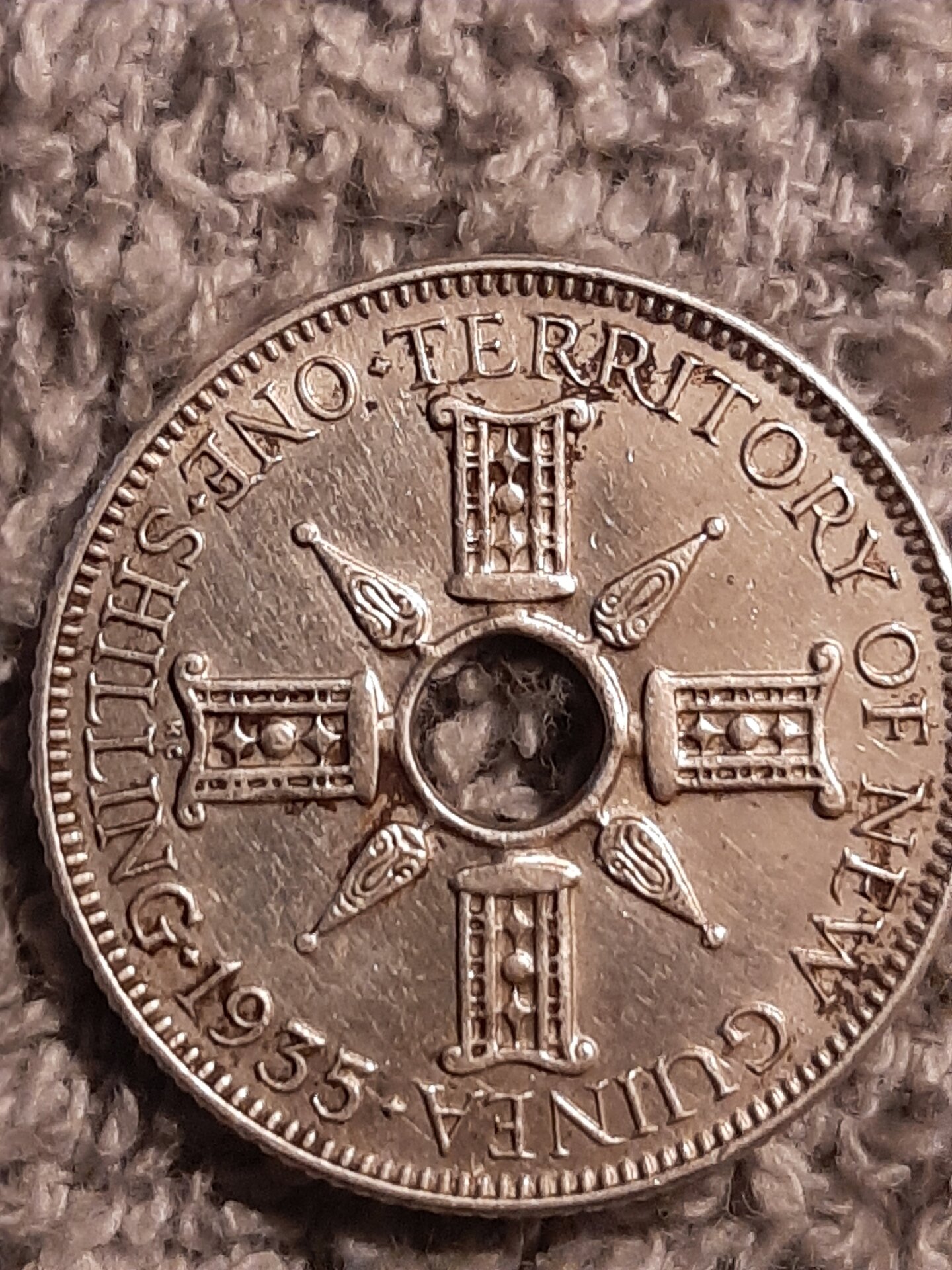 Very sweet find. 1935 New Guinea, One Shilling, .925 silver, mintage-2,100,000 I am not sure what grade your coins is ? VF20-$2.75 XF40-$4.50 weight-5.38 g. or 0.160 oz. KM#5 catalog number