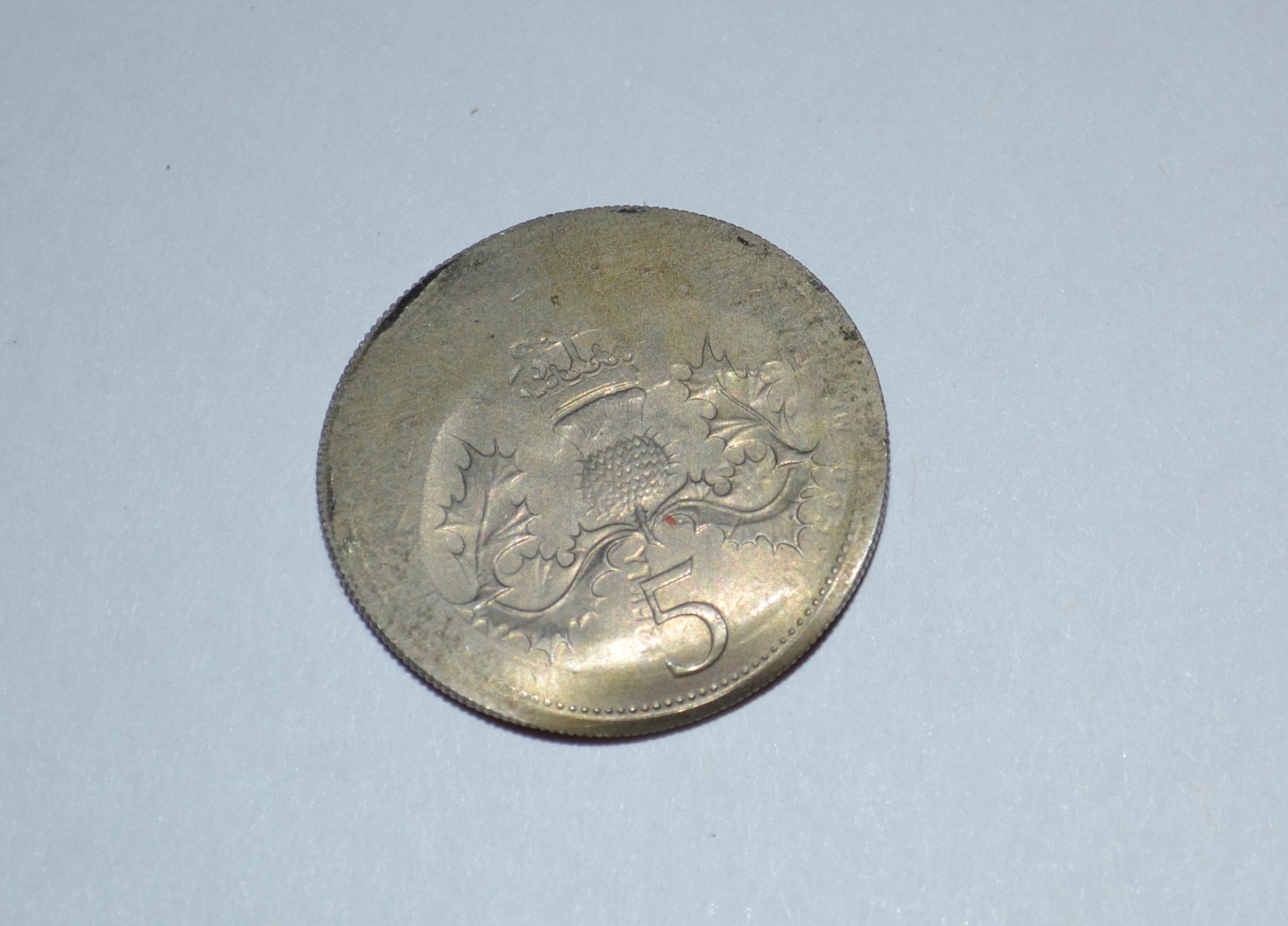 I recently got my hands on what I believe is a counterbrockage 5 pence coin. Could anyone provide me with some more info about it, and what it might be worth?