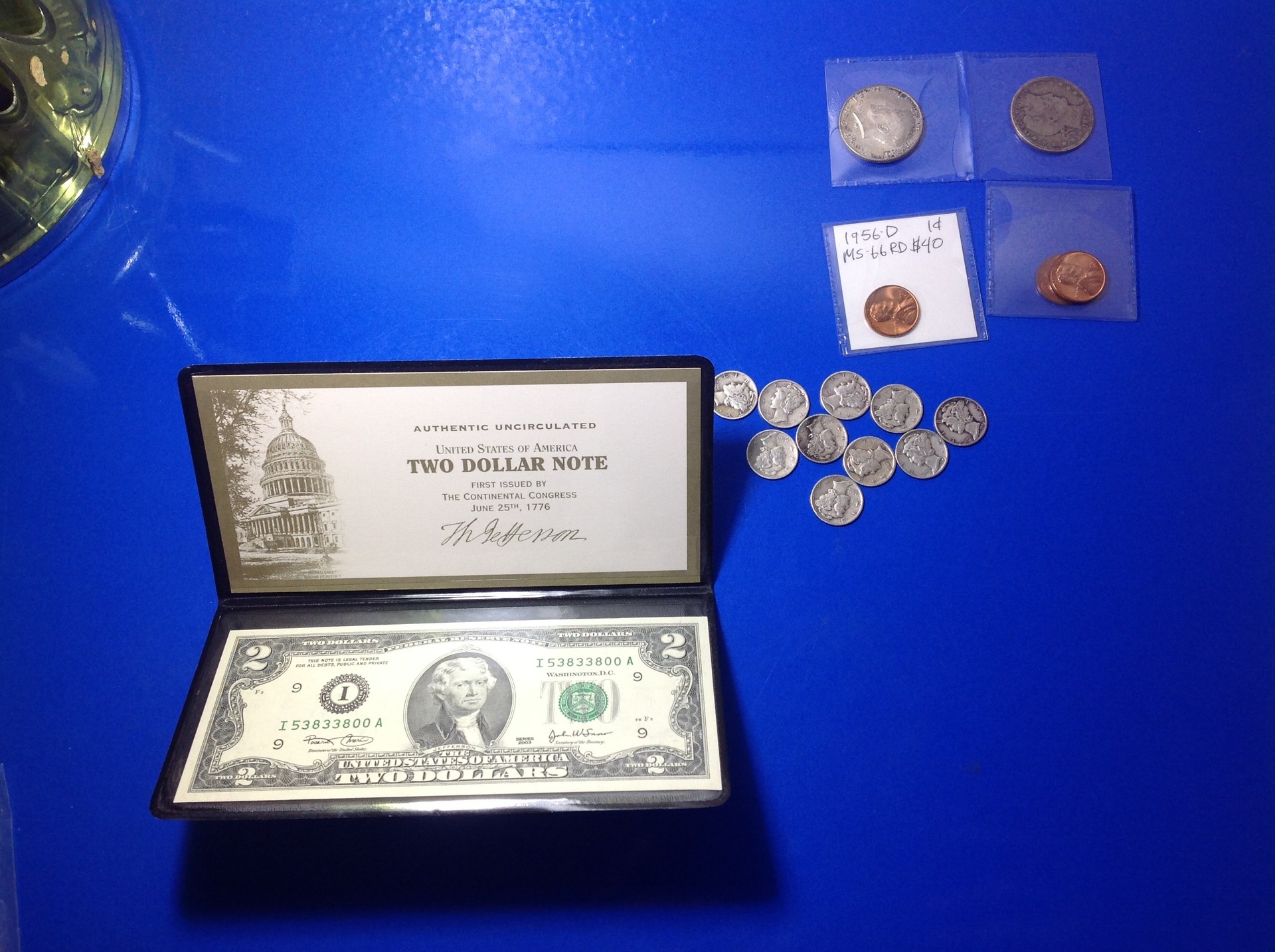 1/8 Yay! SUPER PSYCHED ! My contest winning from a youtuber (richcali21) ! Was only expecting 10 mercury dimes but ended up getting an UNC 2 dollar bill, 3 BU wheatie a and 2 halves including a 1964 and 1912 S !! Thanks alot !