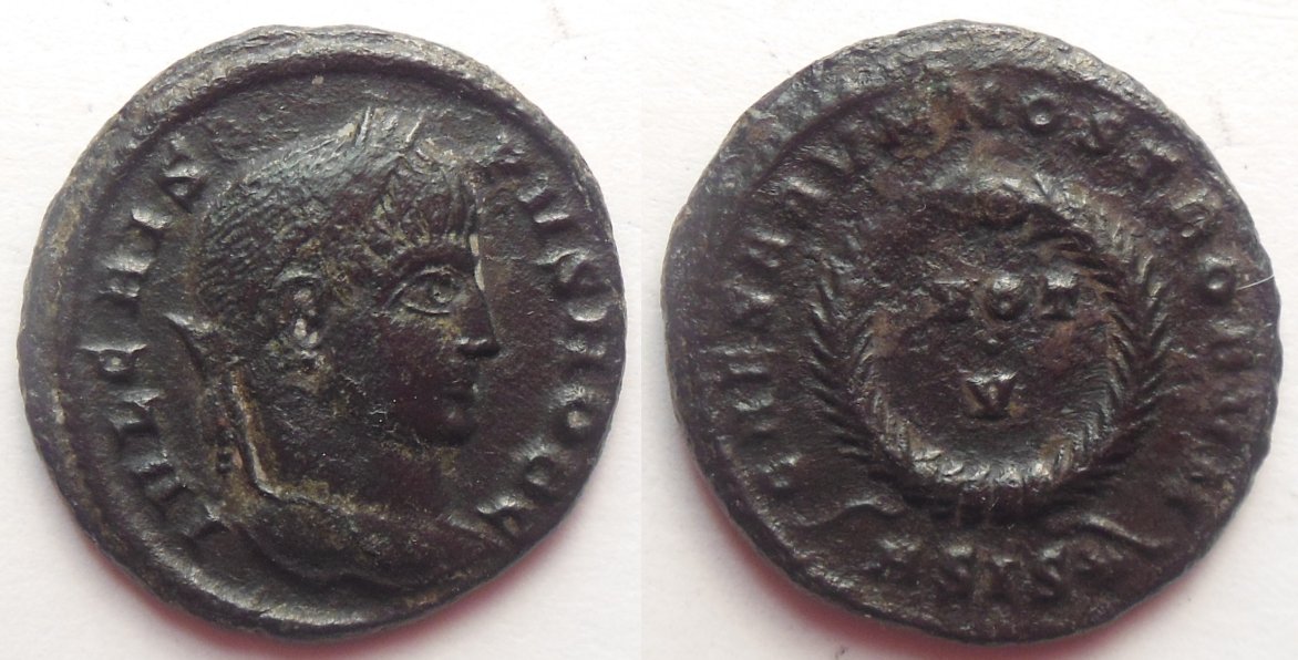 Crispus AE3. 320-321 AD. Siscia mint, 3.4g, 19mm OBV: IVL CRISPVS NOB C. Laureate head right. REV: CAESARVM NOSTRORVM around laurel wreath containing VOT V, ASIS star in ex. REF: RIC VII Siscia 161 This is my second Crispus reverse and in slightly better condition. My other Crispus Campgate has a pleasing Syrian red color but is really worn. Wikipedia copy and paste history