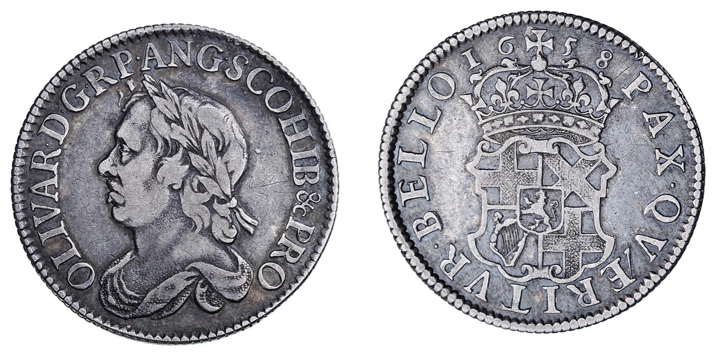 Cromwell's shilling, dated 1658. It's an interesting one for first time there's someone else not a royal bust on the British coinage.
