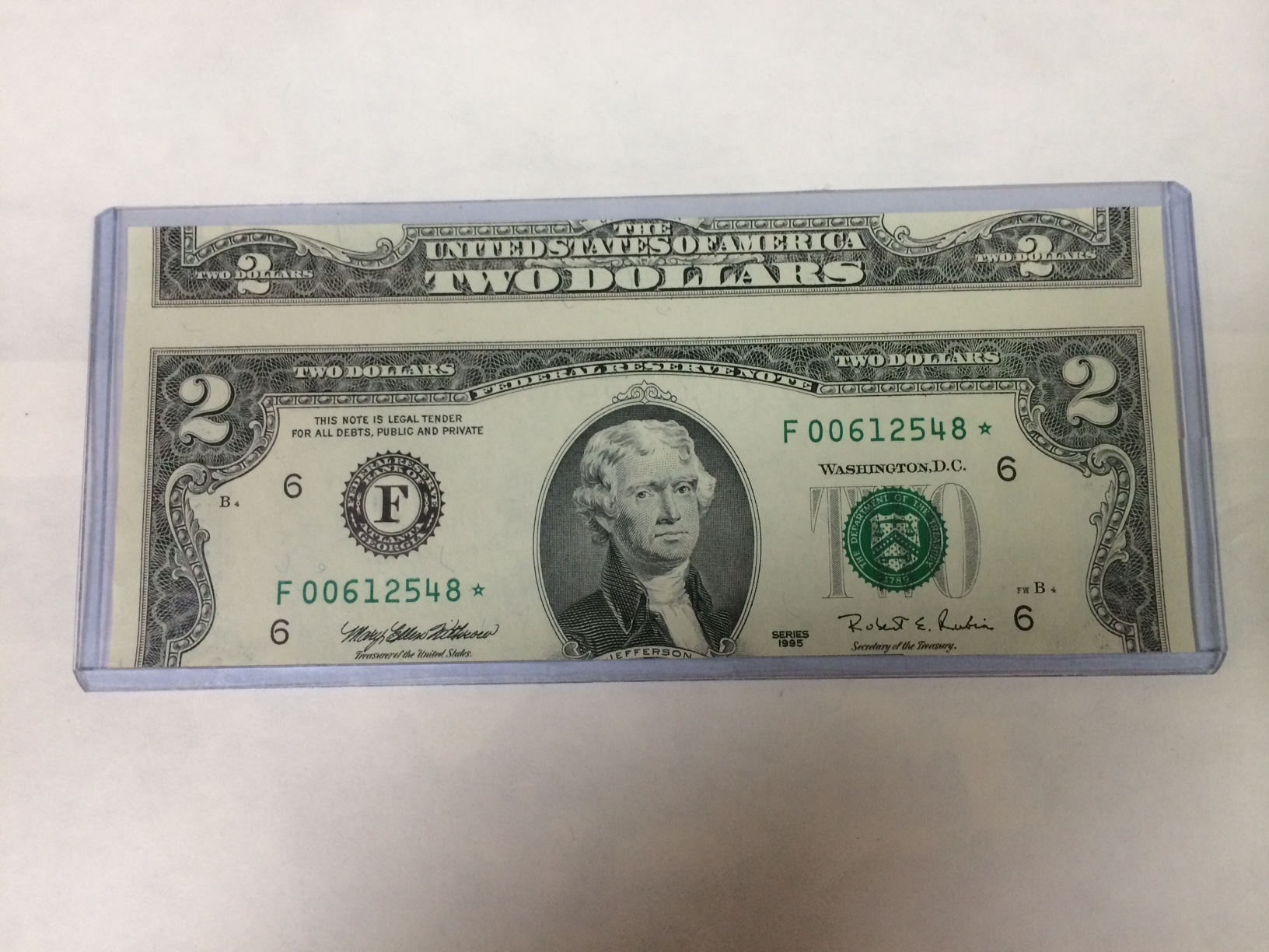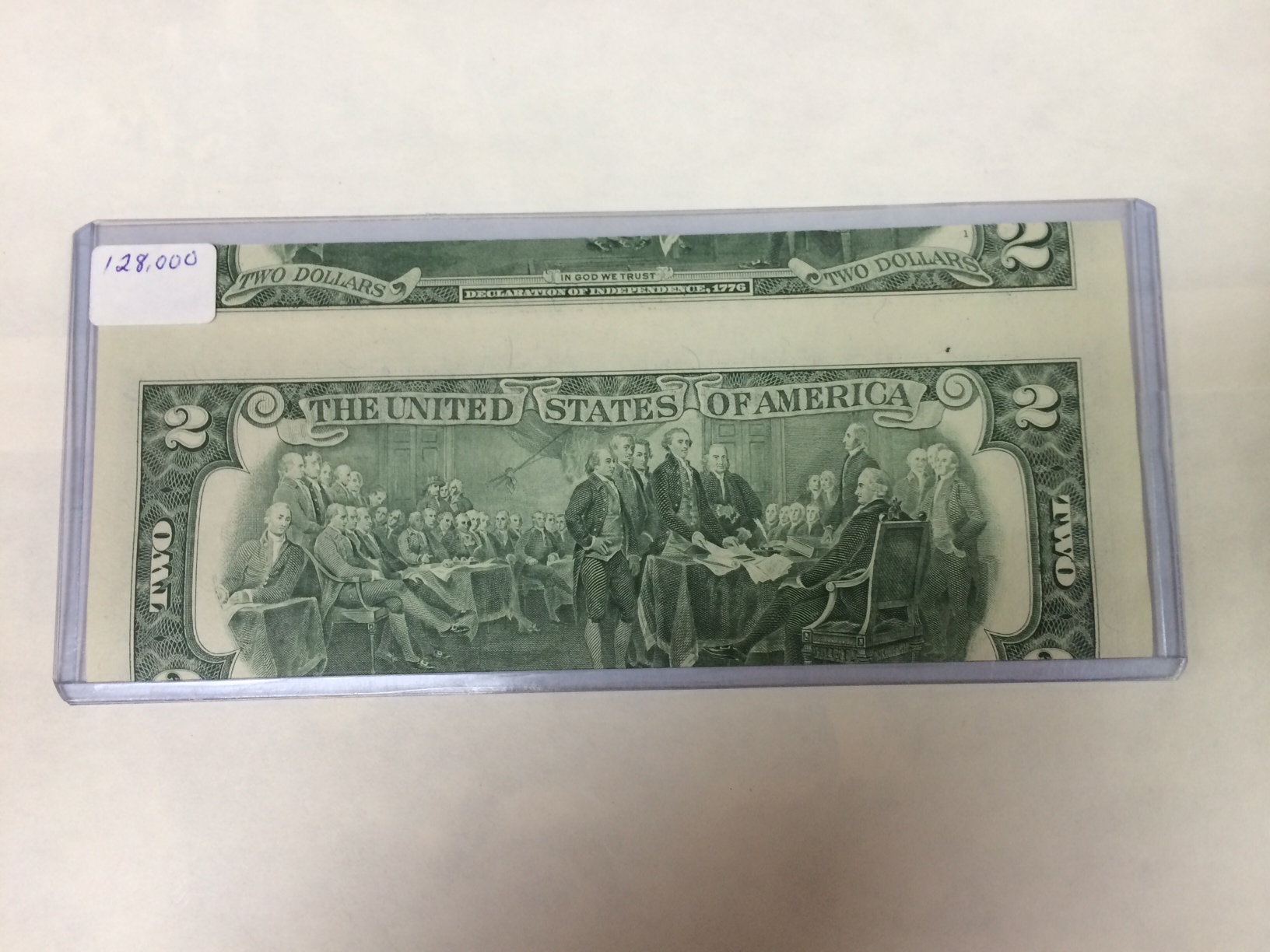 I should have this one back from PCGSC in a couple weeks. When I first got it, my immediate thought was that someone took a sheet of $2 bills (available from BEP) and intentionally mis-cut the sheet. But the serial number proves otherwise. This is a gem, and will fetch at least a 65 grade. Anyone have a clue as to value?