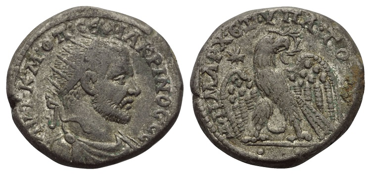 I like @TIF's idea of a long eared Owl, fits well. My minds eye has me thinking it may be a Falcon wearing a hood, a little abstract yes but plausible ? Nice coin @Al Kowsky, a little too shiny for me though as I like a bit of circulation showing. MACRINVS - CARRHAE, MESOPOTAMIA