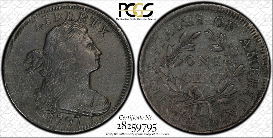 A 1797 large cent. Was borderline on the environmental damage detail. This was it in the initial pcgs slab