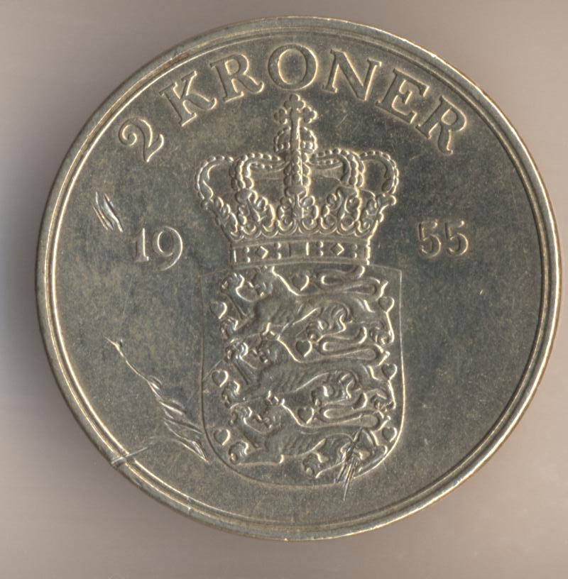 New purchase. 2 kroner 1955, aluminium-bronze, mintage - 457000 pcs. Mint masters Niels Peter Nielsen & Harald Salomon. Copenhagen Mint.
