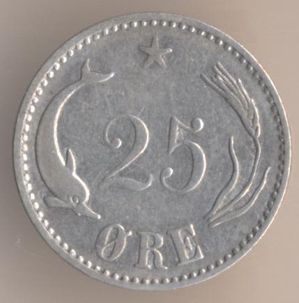 25 ore 1905, silver .600, weight - 2,42 g., size - 17 mm, mintage - 1722000 pcs. Ruler: king Christian IX (1863-1906). Demonetized at September 30 2008!