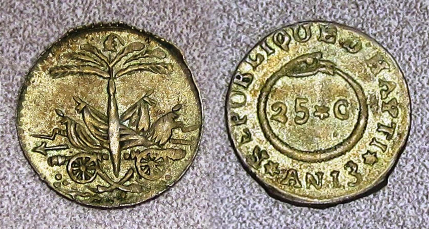 The next thing you may notice is the year AN13 on the coin. There are two dating systems used on 19th Century Haitian coins. One dating system is the “Christian” dating system and the other is the “Revolutionary” dating system. In 1803 the French were permanently ousted by the Hayti revolution. After 1803 the new republic used a revolutionary dating system where each year after the revolution was AN1, AN2, AN3, etc. Therefore, the depicted coin dated AN 13 would be 1816 using the Christian dating system. According to Kraus, the establishment of Haiti as a republic makes it the oldest black republic in the world and the 2nd oldest republic (next to the United States) in the Western Hemisphere. Please post your coins from Haiti.