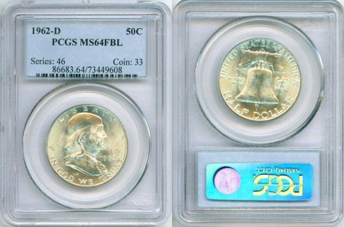 Got this to fill my 1962 registry set... 1962-d MS64FBL Franklin half dollar. After quite a bit of searching around the cheapest I found was running about $70 (cheapest on e-bay was $85) My friend/dealer sent me an e-mail tonight saying his friend.. was putting this up BIN for only $55 (ain't want lists with a trusted dealer great ). I jumped. Was a tough choice before this offer between a ms64fbl with minor rainbow toning that looked more like a 62/63 for 85 or a ms65 at $115 (this one was probably a MS64 and wouldn't get MS65 in a reslab) anyhoo I think I did well on this one what do you think... Should have it in hand in a few days won't ship until Wed