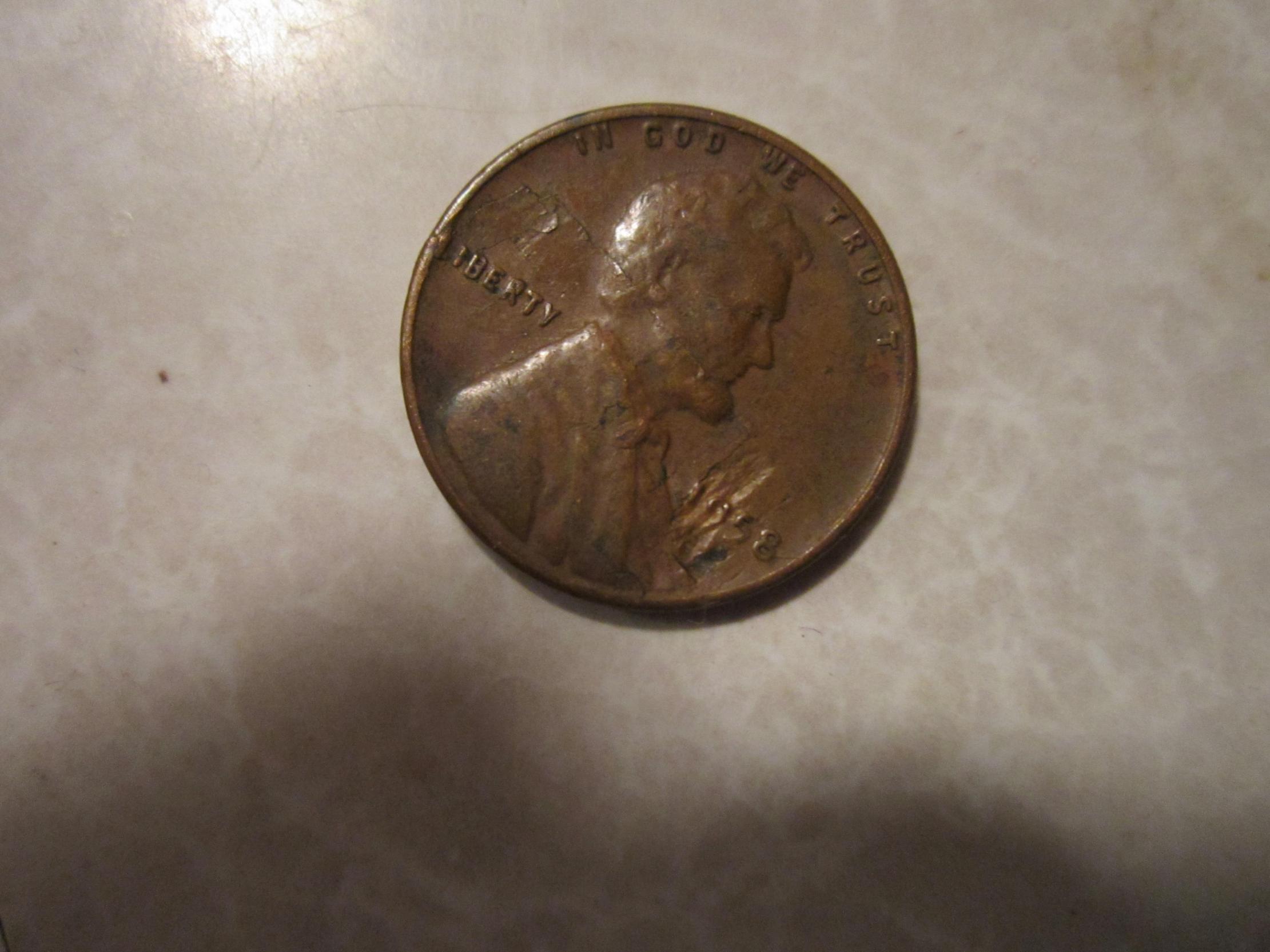 I found this coin while sorting through some wheats that I found lying around the house. There are a couple of areas on the obverse that obviously aren't "normal." I'm looking for opinions as to whether these were caused by a defective die or if the coin has been damaged somewhere along the way.